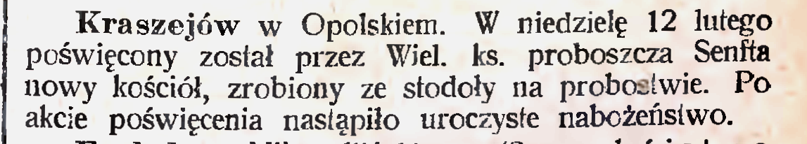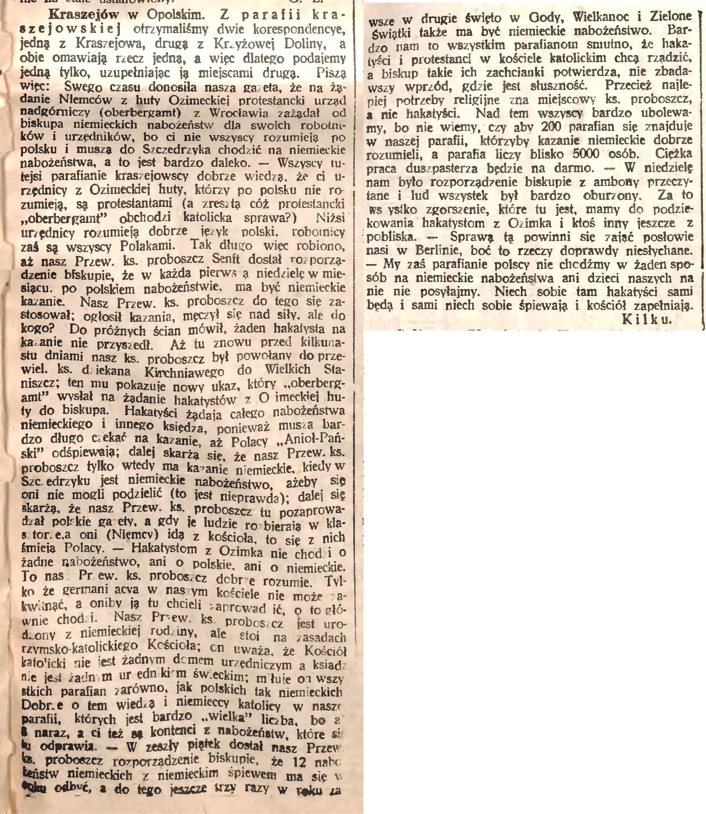 W Krasiejowie na początku XX wieku nabożeństwa w języku niemieckim odprawiano trzy razy w roku w drugie dni Wielkanocy, Zielonych Świątek i Bożego Narodzenia. Kazania niemieckie głoszono w ostatni dzień Starego Roku i w odpust św. Małgorzaty. W pierwszą niedzielę postu czytanio list pasterski po niemiecku. W niedzielę i święta czytano po niemiecku Ewangelię, a wielkim poście po nieszporach odprawiana była droga krzyżowa w języku niemieckim. Taki stan nie podobał się władzom hutniczym w Ozimku, wg których niemieccy pracownicy nie mieli możliwości uczestniczenia w liturgii odprawianej w języku niemieckim. Urząd Górniczy zwrócił się do kardynała Georga Koppa (1837-1914), aby nakazał ks. Maksymilianowi Senftowi (1864-1927) wygłaszanie raz w miesiącu niemieckich kazań. Były one jednak głoszone po mszy i osoby, które nie chciały ich słuchać mogły wyjść z kościoła.