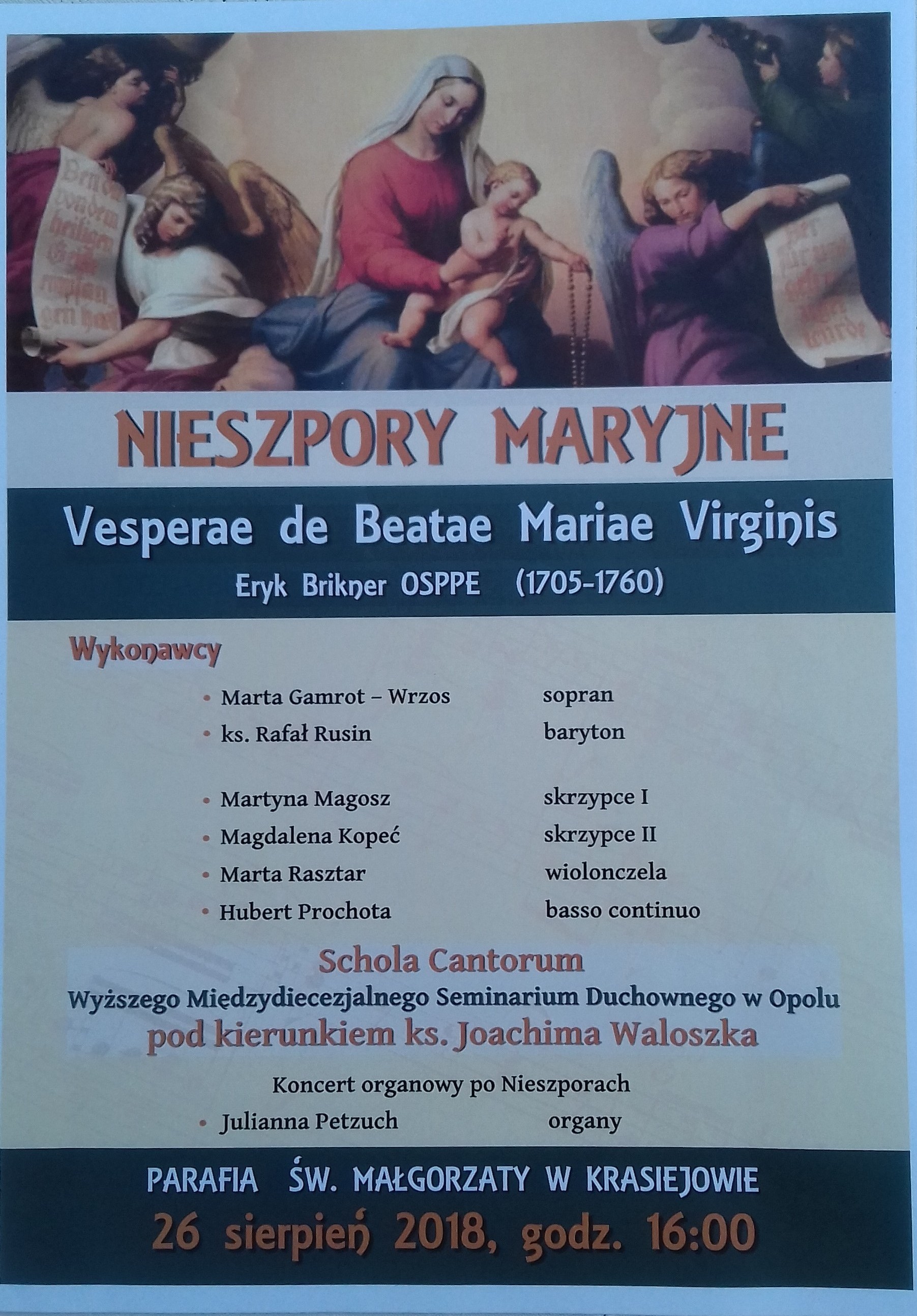 Zespół zainaugurował swój koncert Bogurodzicą, zaśpiewał oprócz znanych pieśni maryjnych min. Alleluja, wzniosłe Sanctus, Barkę, Czarną Madonnę. Dyrygent zespołu zachęcił wszystkich uczestników mszy do wspólnego śpiewania tych dwóch ostatnich piosenek. Oklaskom nie było końca. Na bis zespół miał w zanadrzu śląskie piosenki ludowe: „Poszła Karolinka do Gogolina”, „Od Siewierza wieje wiatr”. Niecodziennie zabrzmiało to w naszym kościele. Takiego koncertu i spotkania z kulturą wysoką dawno w kościele nie było i chyba długo nie będzie.