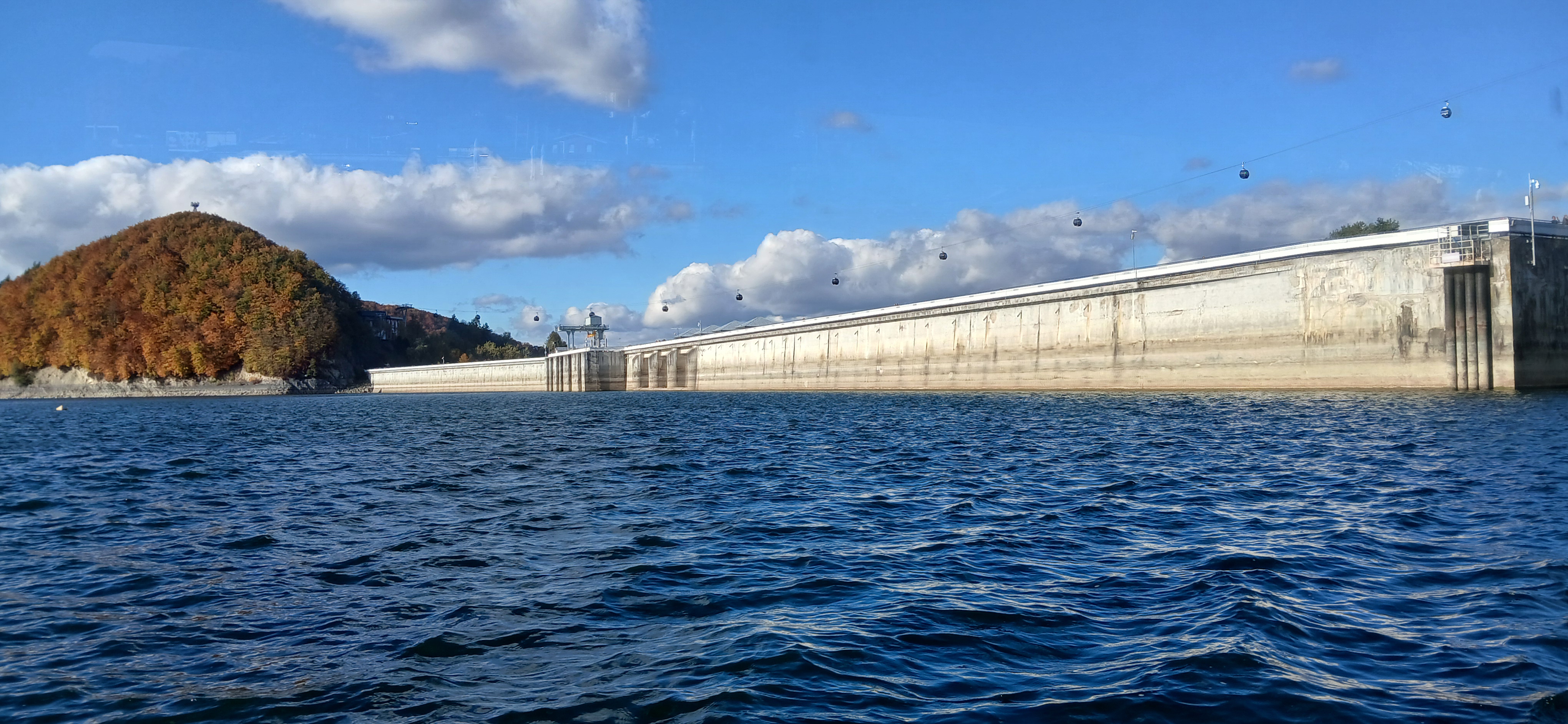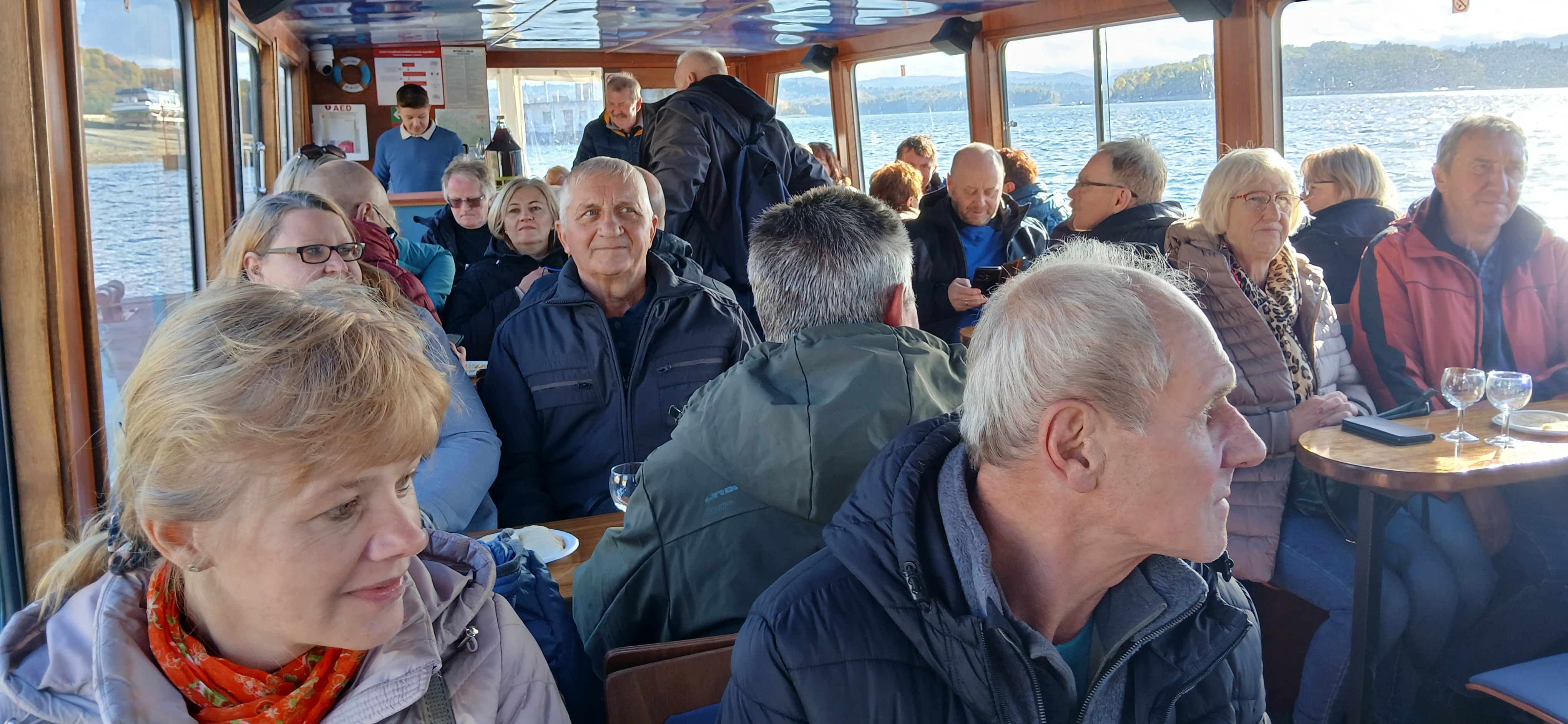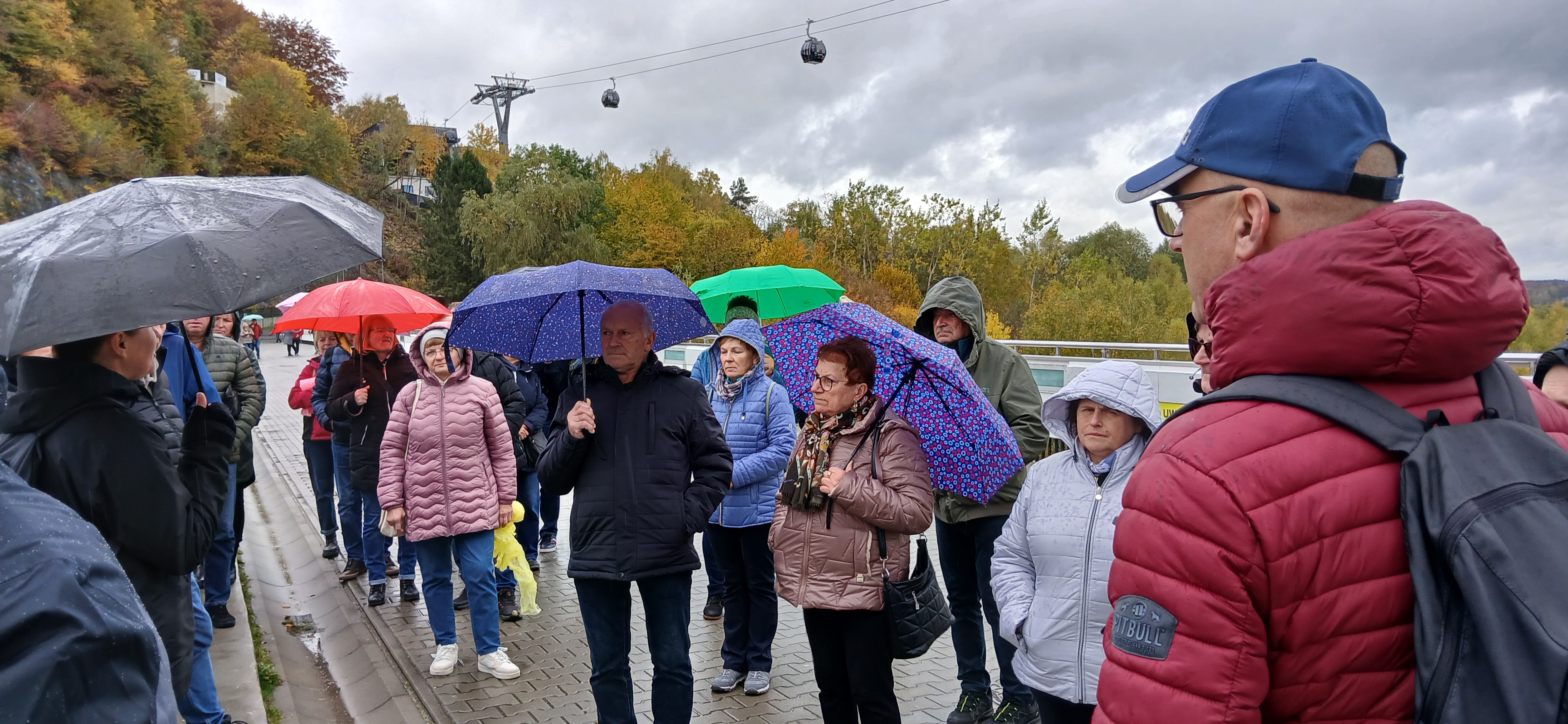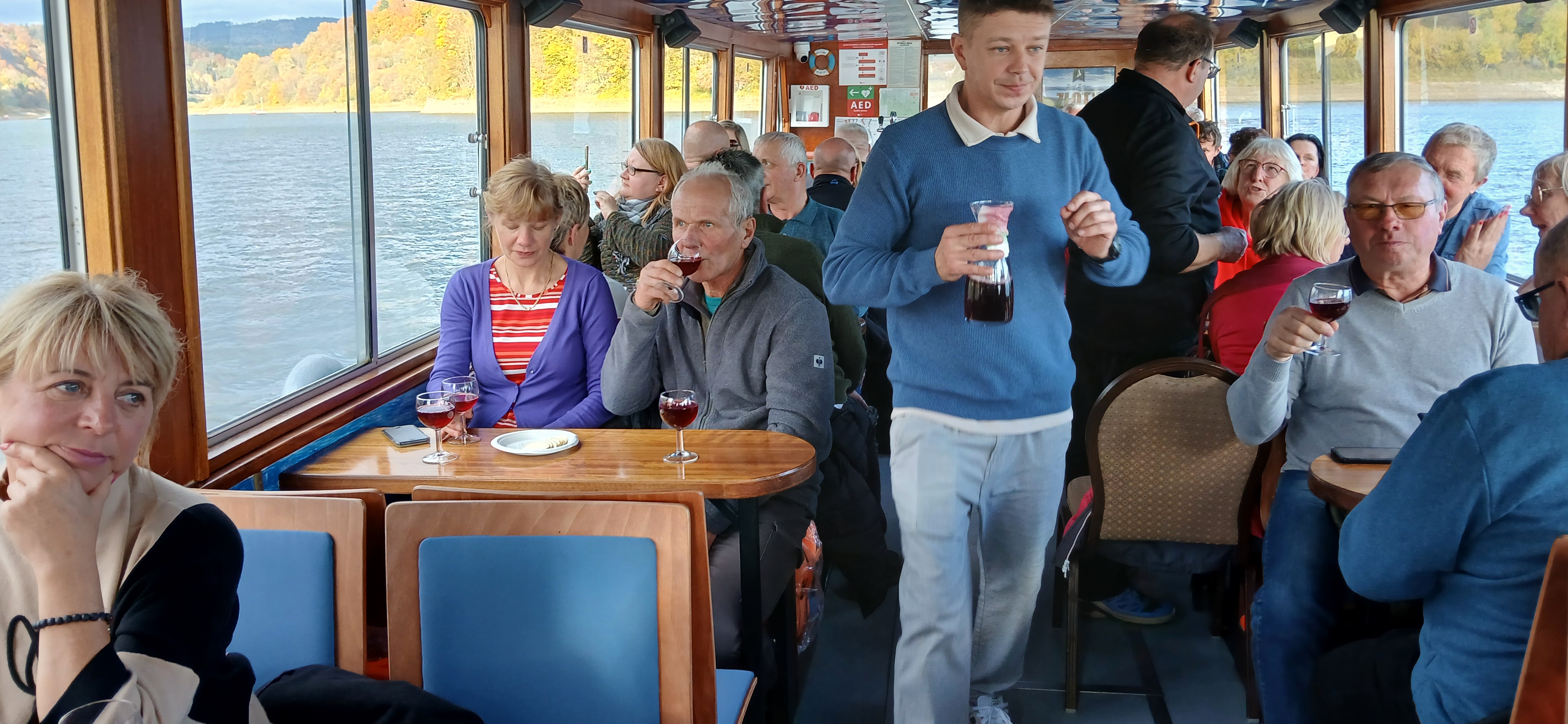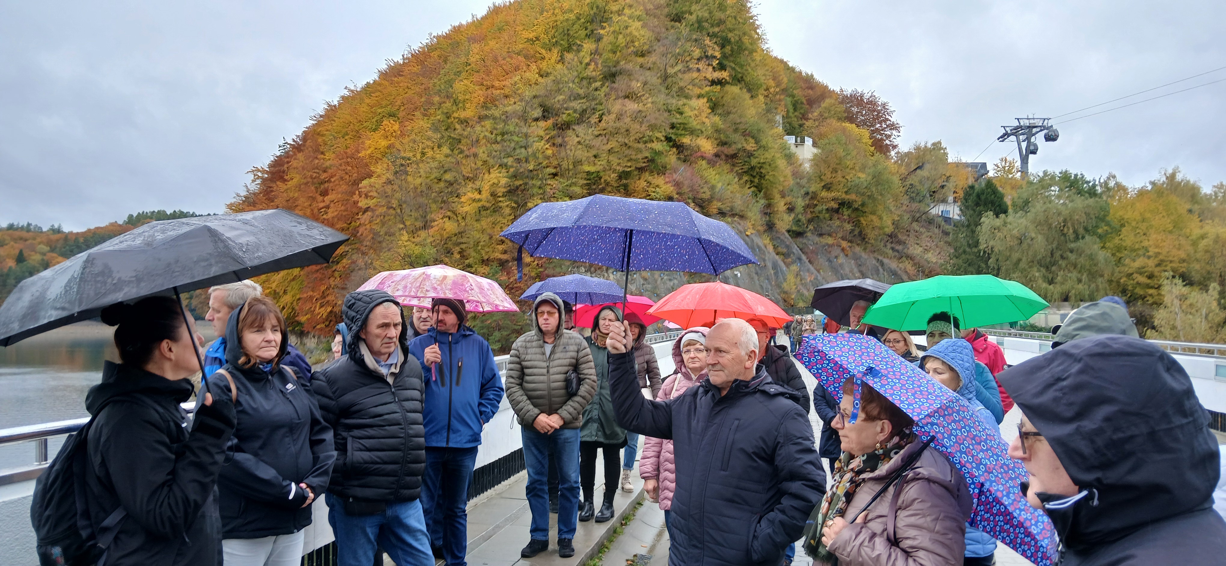 Następnie udaliśmy się nad jezioro Solińskie i do zapory na rzece San - największej w Polsce, przy której wybudowano elektrownie wodną. W czasie wolnym wiele osób zdecydowało się na atrakcyjną przejażdżkę gondolową kolejką linową wznoszącą się wysoko nad zaporą. Solina razem z jeziorem Myczkowskim stanowi całość i pełni ważną rolę gospodarczą i przeciwpowodziową. Mieliśmy możliwość zwiedzenia serca elektrowni i korytarzy tego hydrologicznego obiektu od wewnątrz, co było dla wielu nie lada przeżyciem. Nie mogliśmy jednak fotografować elektrowni od środka. Po opuszczeniu obiektu udaliśmy się do przystani i popłynęlimy statkiem w dwugodzinny rejs połączony z degustacją dobrych węgierskich win. Słoneczna pogoda, jakby na nasze zamówienie, umożliwiła podziwianie pięknych i stromych brzegów jeziora z górnego pokładu statku oraz otaczających zbiornik lasów we wszystkich kolorach jesieni. Po rejsie udalimy się w drogę powrotną do hotelu na obiadokolację.