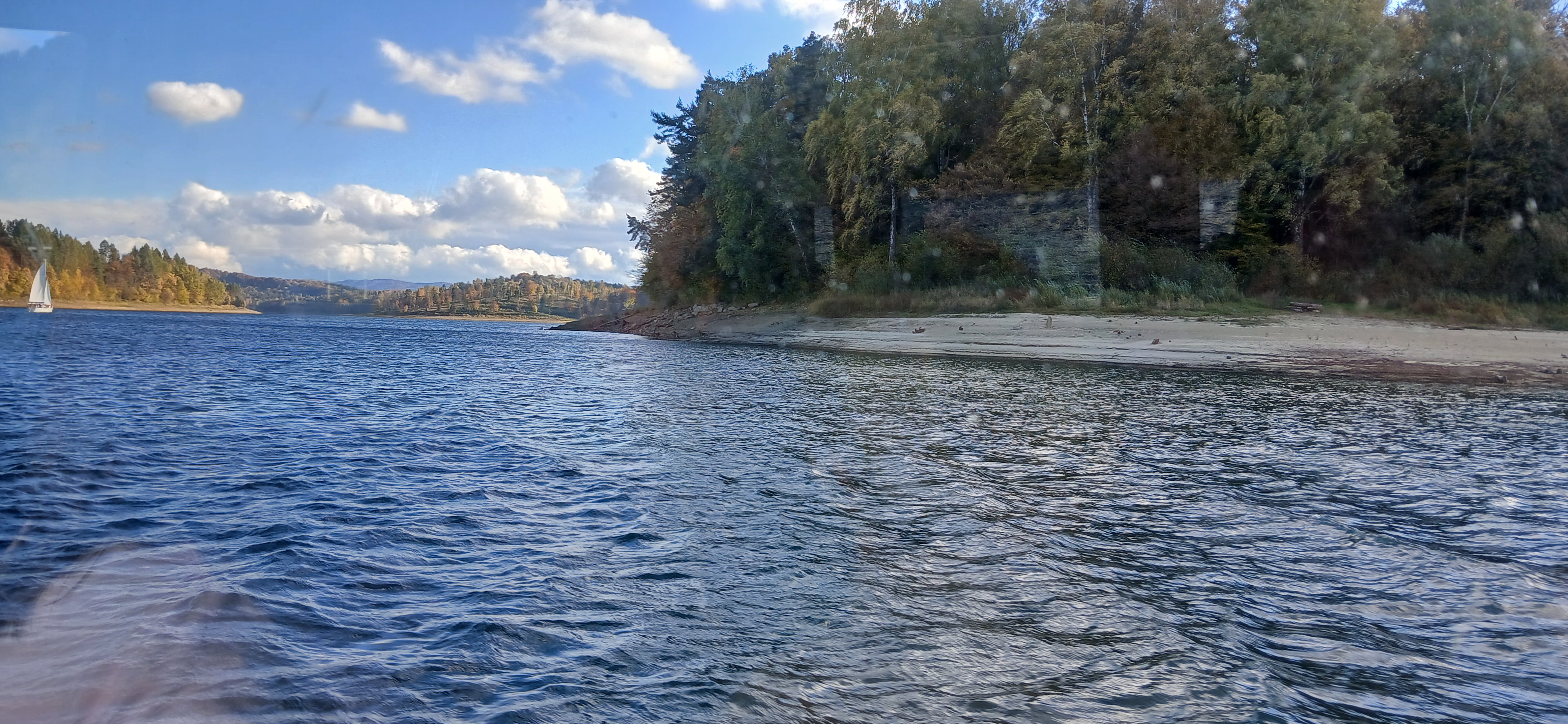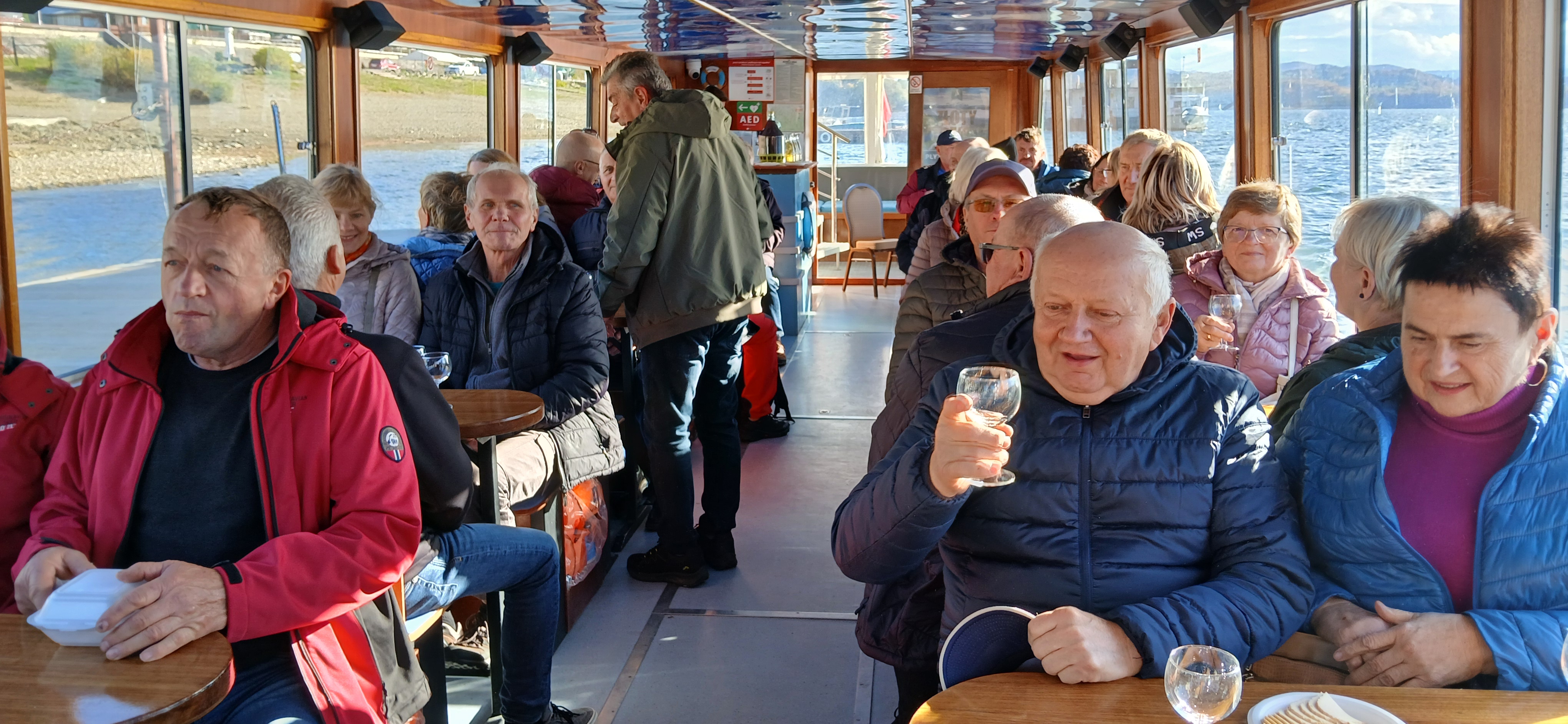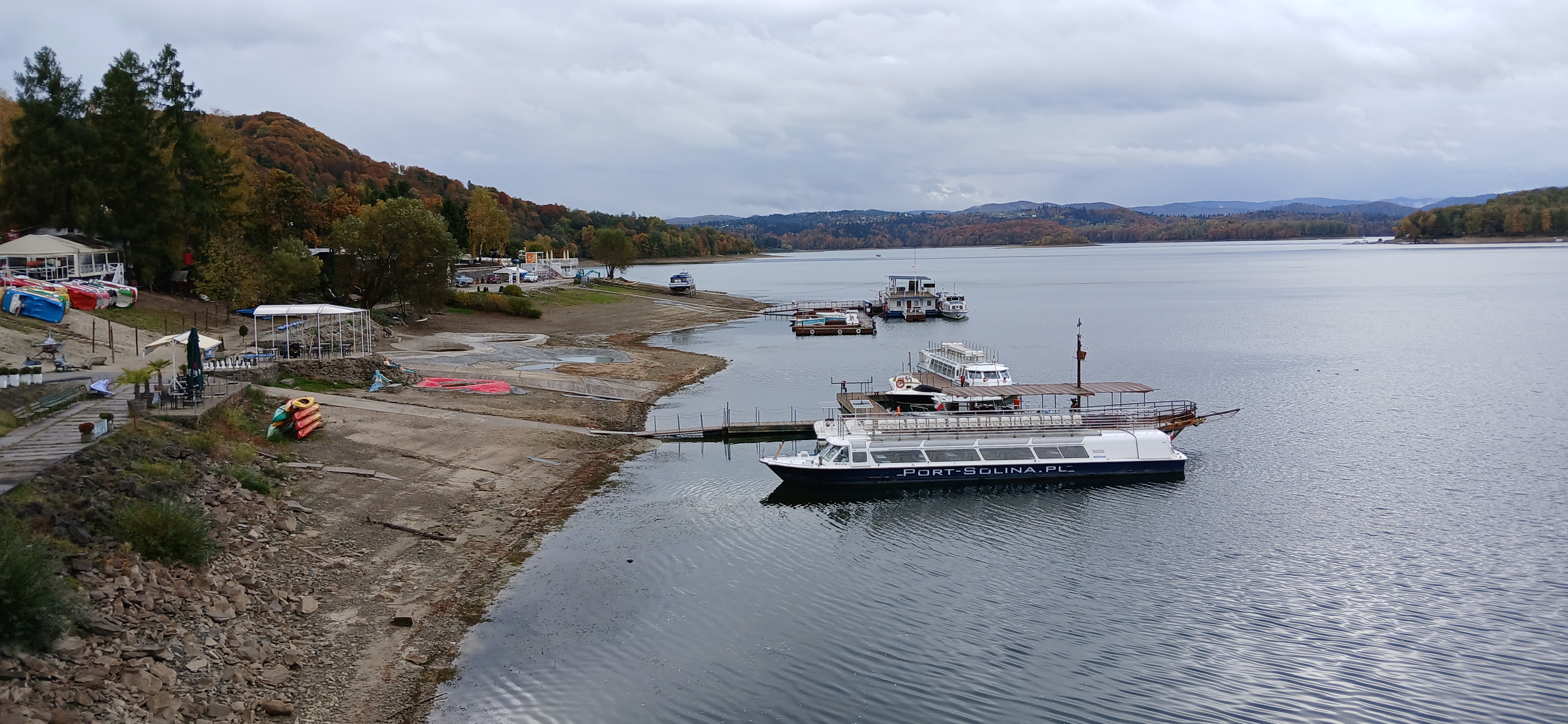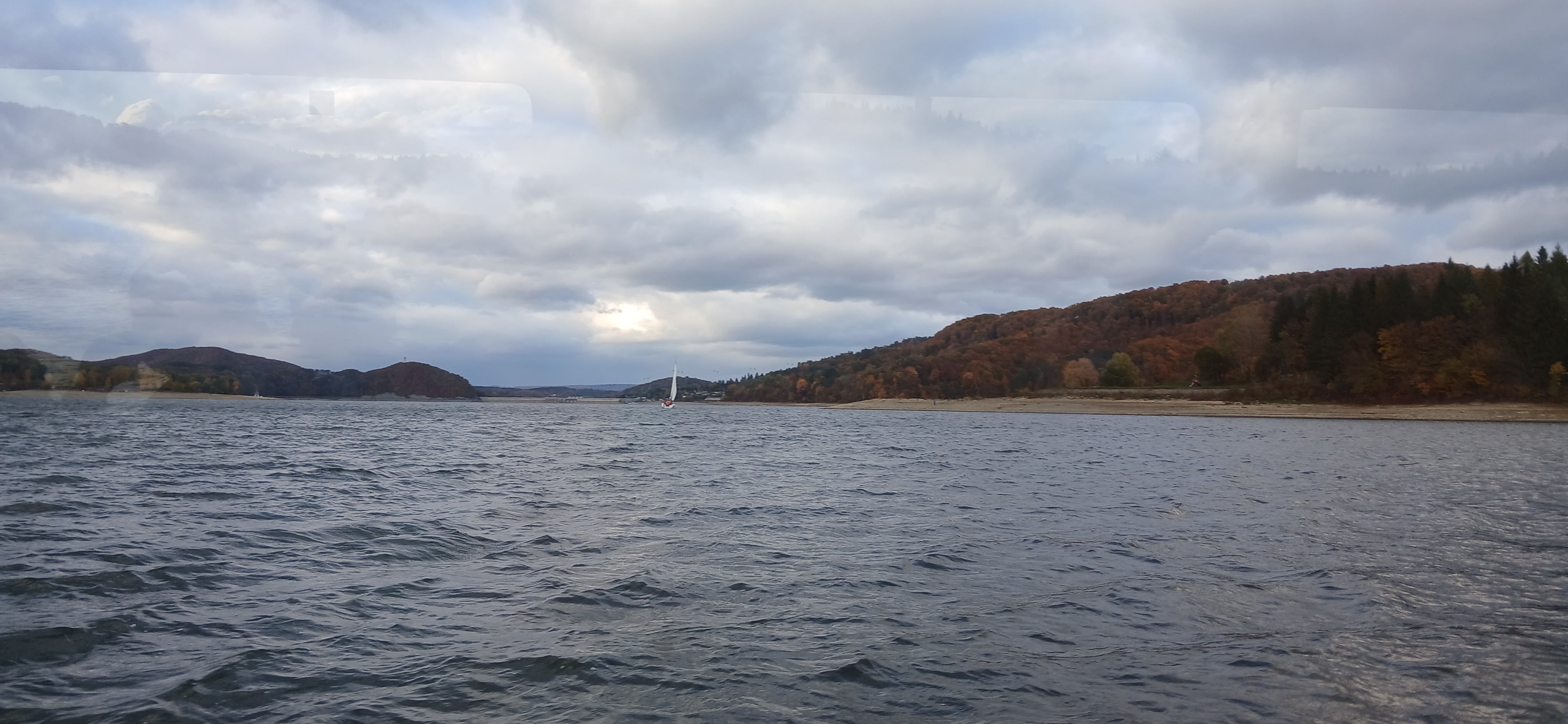 Następnie udaliśmy się nad jezioro Solińskie i do zapory na rzece San - największej w Polsce, przy której wybudowano elektrownie wodną. W czasie wolnym wiele osób zdecydowało się na atrakcyjną przejażdżkę gondolową kolejką linową wznoszącą się wysoko nad zaporą. Solina razem z jeziorem Myczkowskim stanowi całość i pełni ważną rolę gospodarczą i przeciwpowodziową. Mieliśmy możliwość zwiedzenia serca elektrowni i korytarzy tego hydrologicznego obiektu od wewnątrz, co było dla wielu nie lada przeżyciem. Nie mogliśmy jednak fotografować elektrowni od środka. Po opuszczeniu obiektu udaliśmy się do przystani i popłynęlimy statkiem w dwugodzinny rejs połączony z degustacją dobrych węgierskich win. Słoneczna pogoda, jakby na nasze zamówienie, umożliwiła podziwianie pięknych i stromych brzegów jeziora z górnego pokładu statku oraz otaczających zbiornik lasów we wszystkich kolorach jesieni. Po rejsie udalimy się w drogę powrotną do hotelu na obiadokolację.
