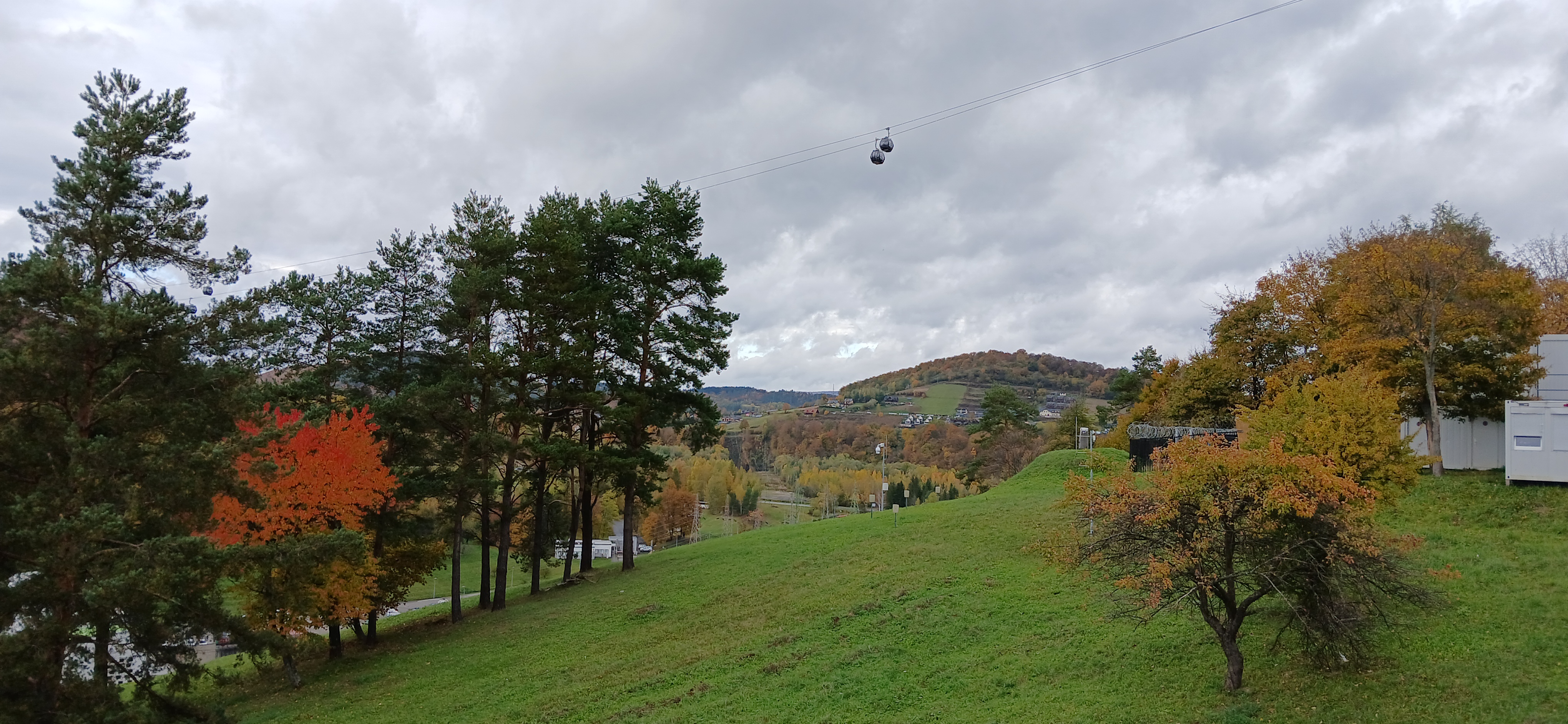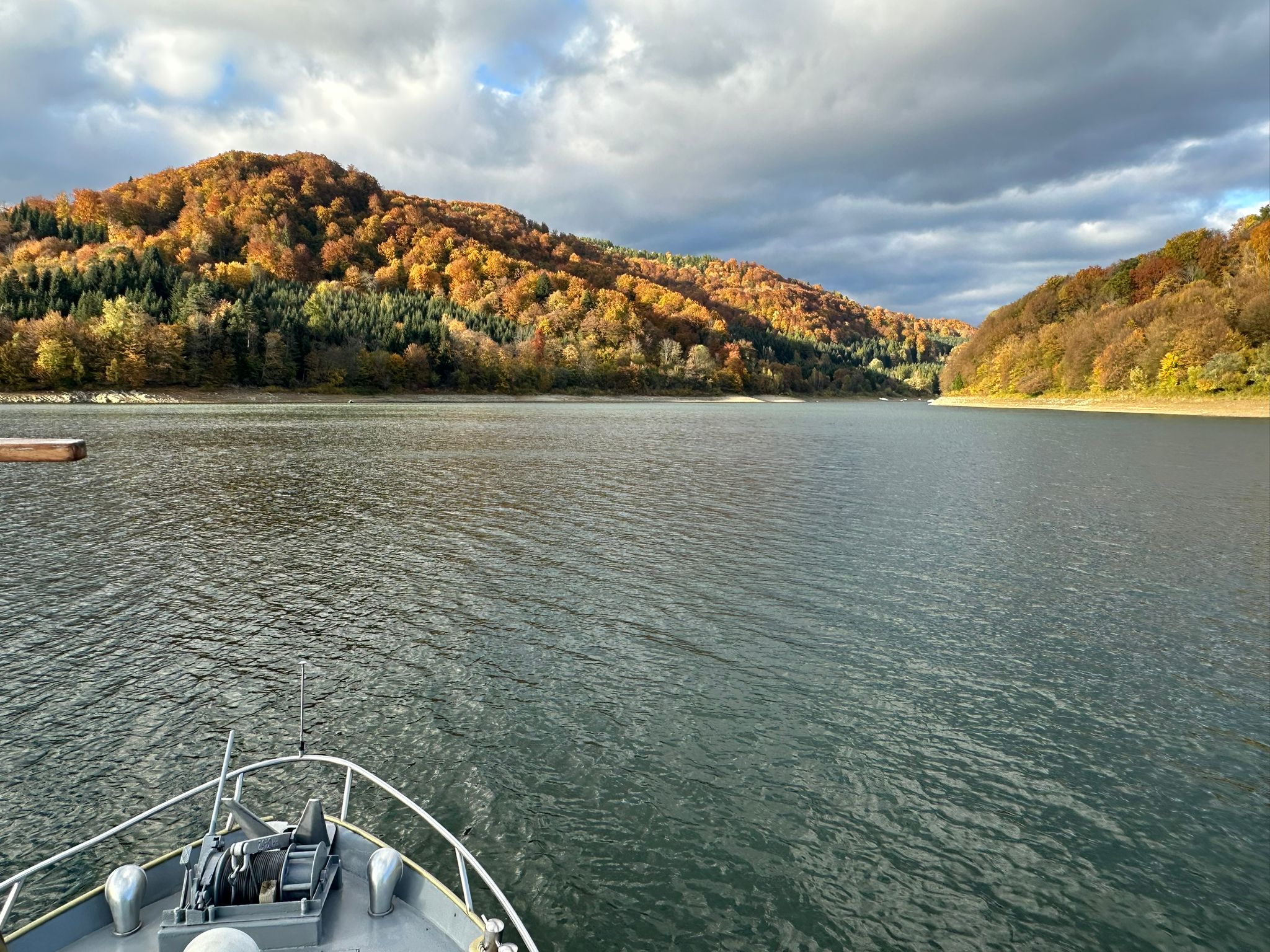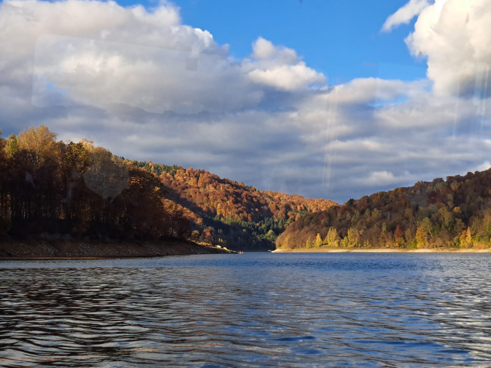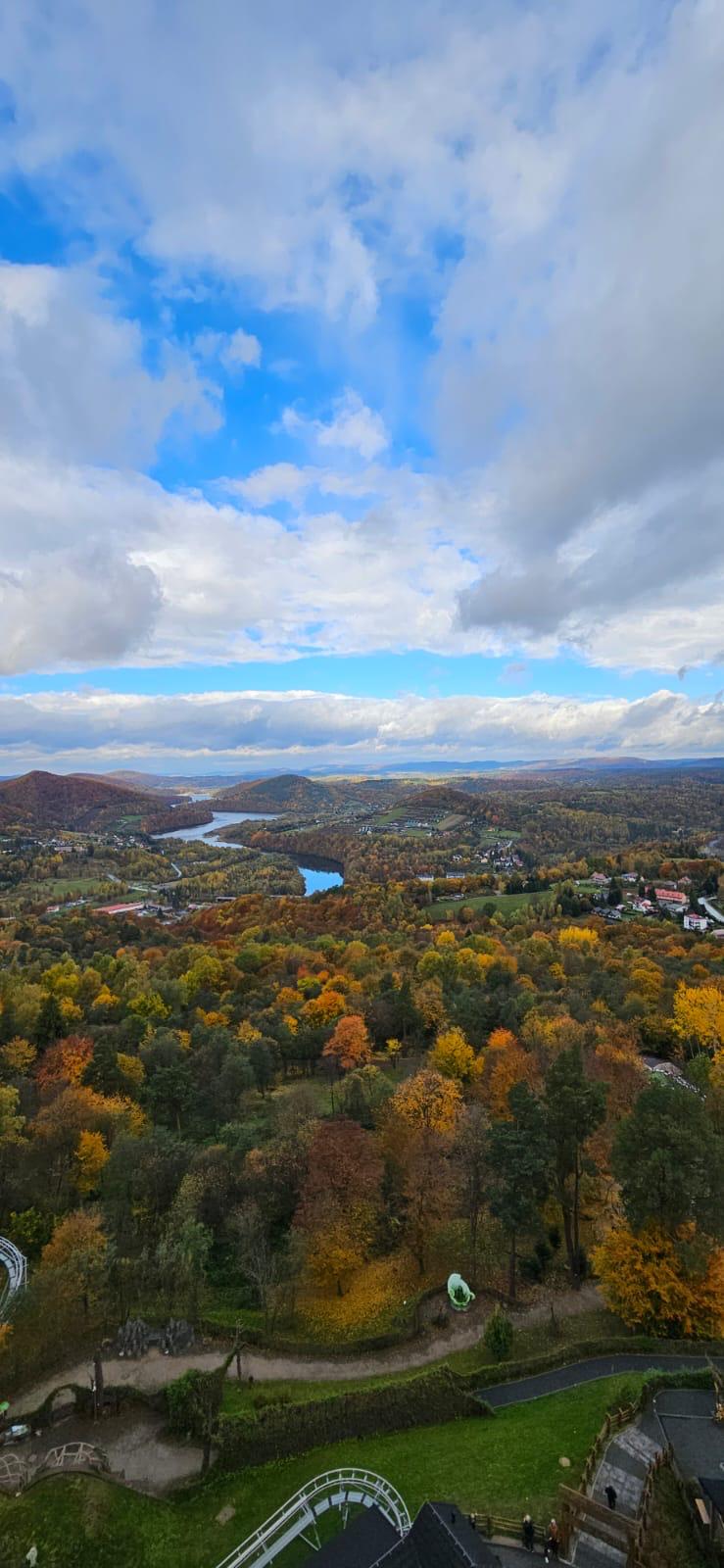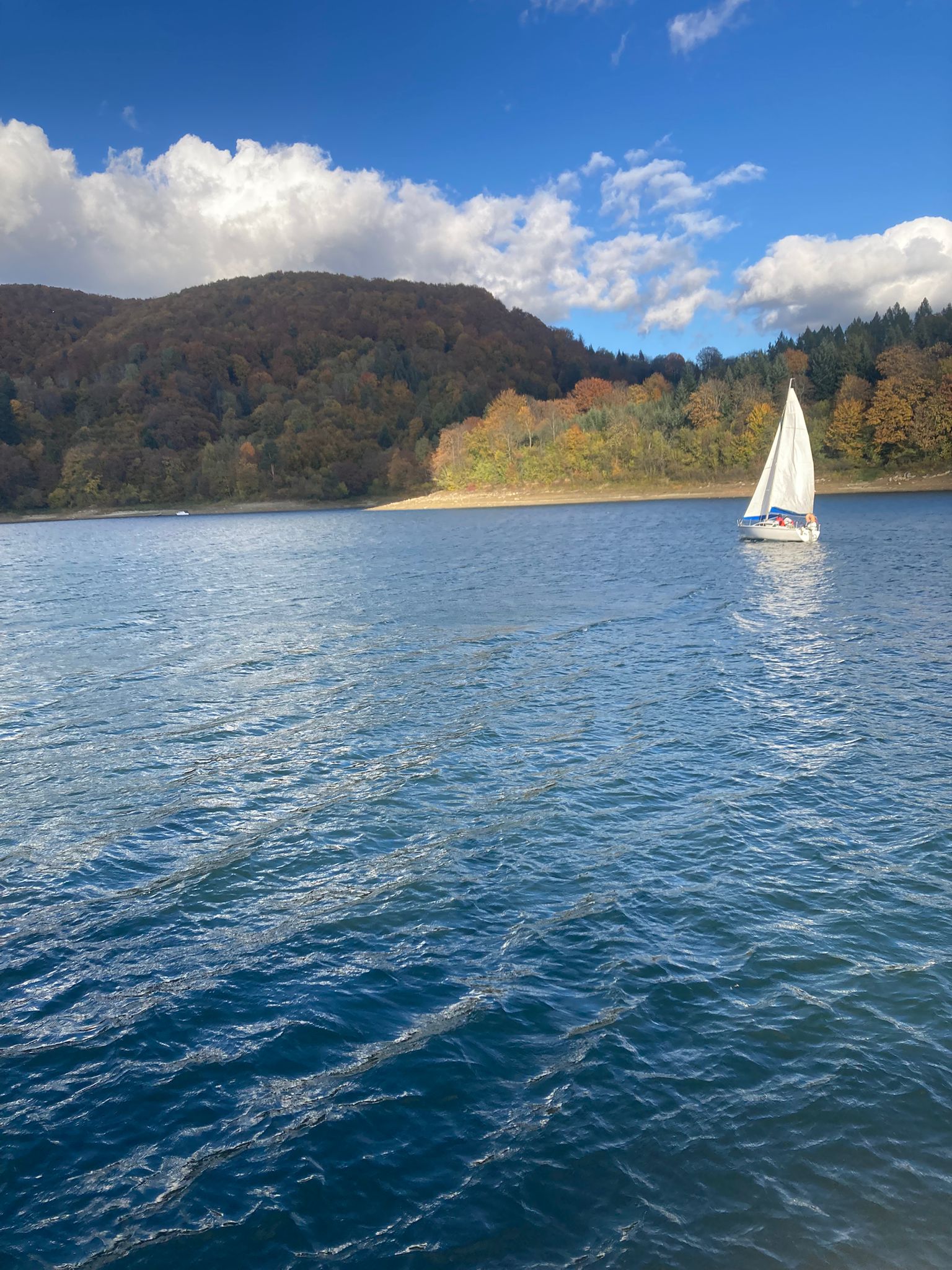 Następnie udaliśmy się nad jezioro Solińskie i do zapory na rzece San - największej w Polsce, przy której wybudowano elektrownie wodną. W czasie wolnym wiele osób zdecydowało się na atrakcyjną przejażdżkę gondolową kolejką linową wznoszącą się wysoko nad zaporą. Solina razem z jeziorem Myczkowskim stanowi całość i pełni ważną rolę gospodarczą i przeciwpowodziową. Mieliśmy możliwość zwiedzenia serca elektrowni i korytarzy tego hydrologicznego obiektu od wewnątrz, co było dla wielu nie lada przeżyciem. Nie mogliśmy jednak fotografować elektrowni od środka. Po opuszczeniu obiektu udaliśmy się do przystani i popłynęlimy statkiem w dwugodzinny rejs połączony z degustacją dobrych węgierskich win. Słoneczna pogoda, jakby na nasze zamówienie, umożliwiła podziwianie pięknych i stromych brzegów jeziora z górnego pokładu statku oraz otaczających zbiornik lasów we wszystkich kolorach jesieni. Po rejsie udalimy się w drogę powrotną do hotelu na obiadokolację.