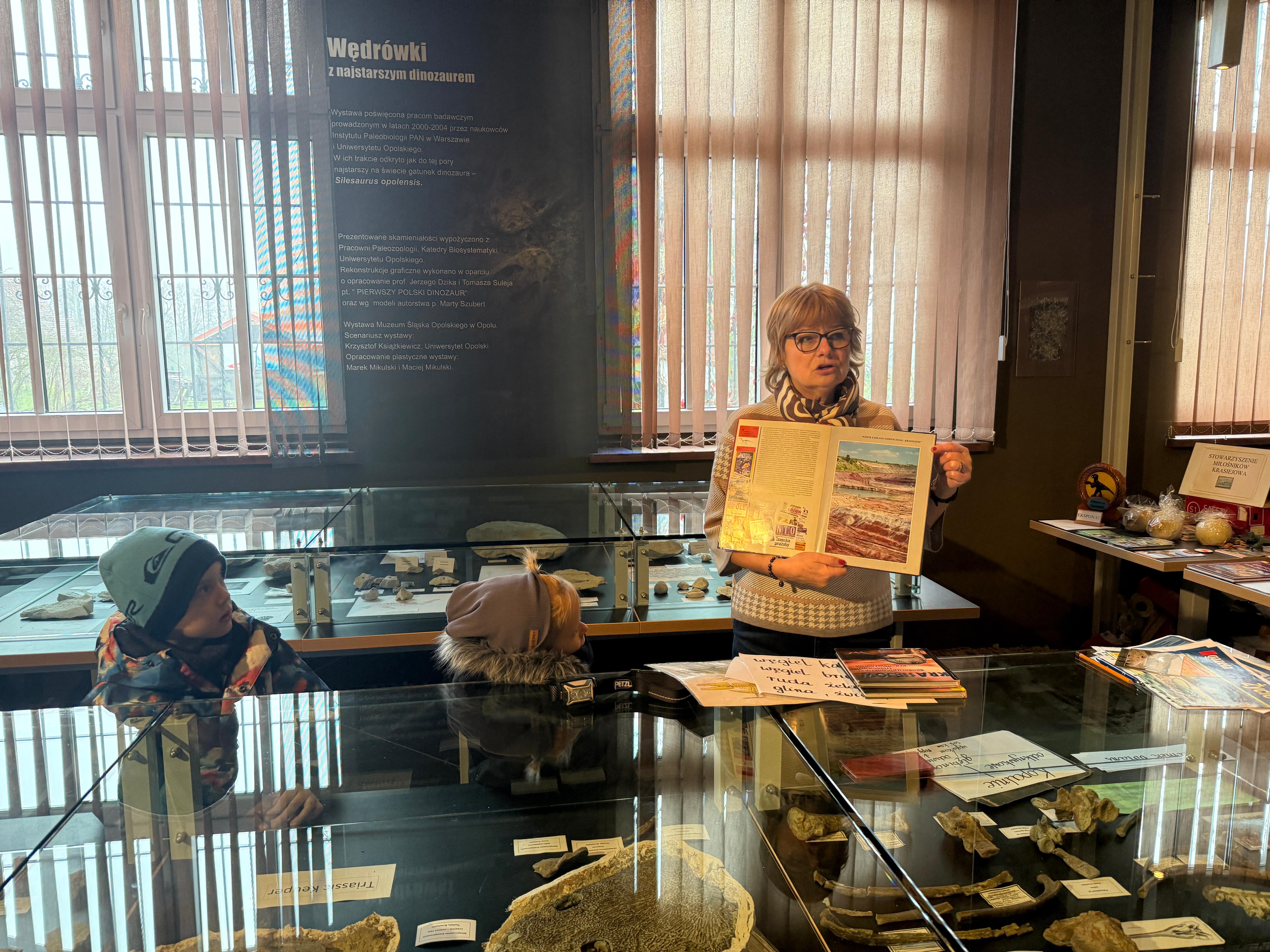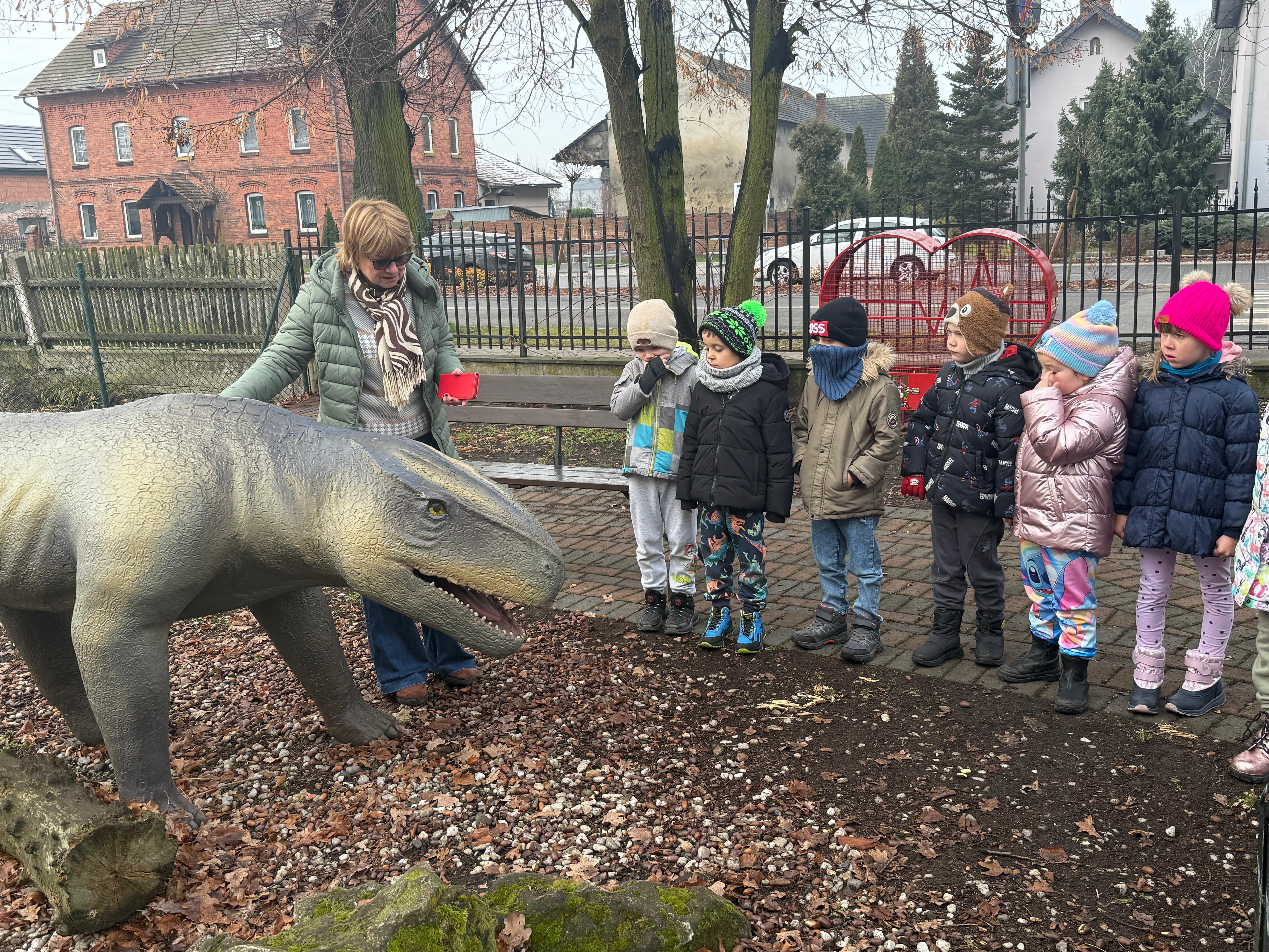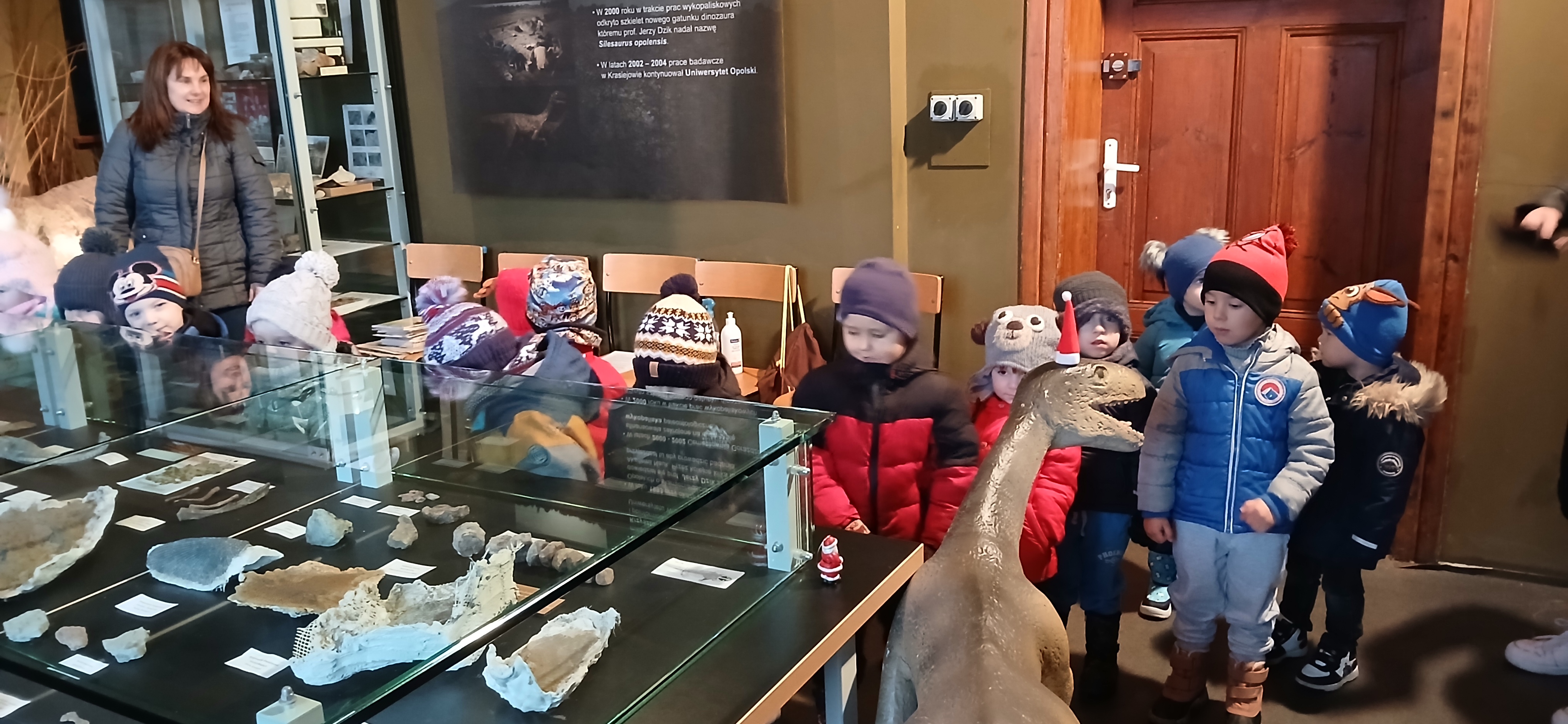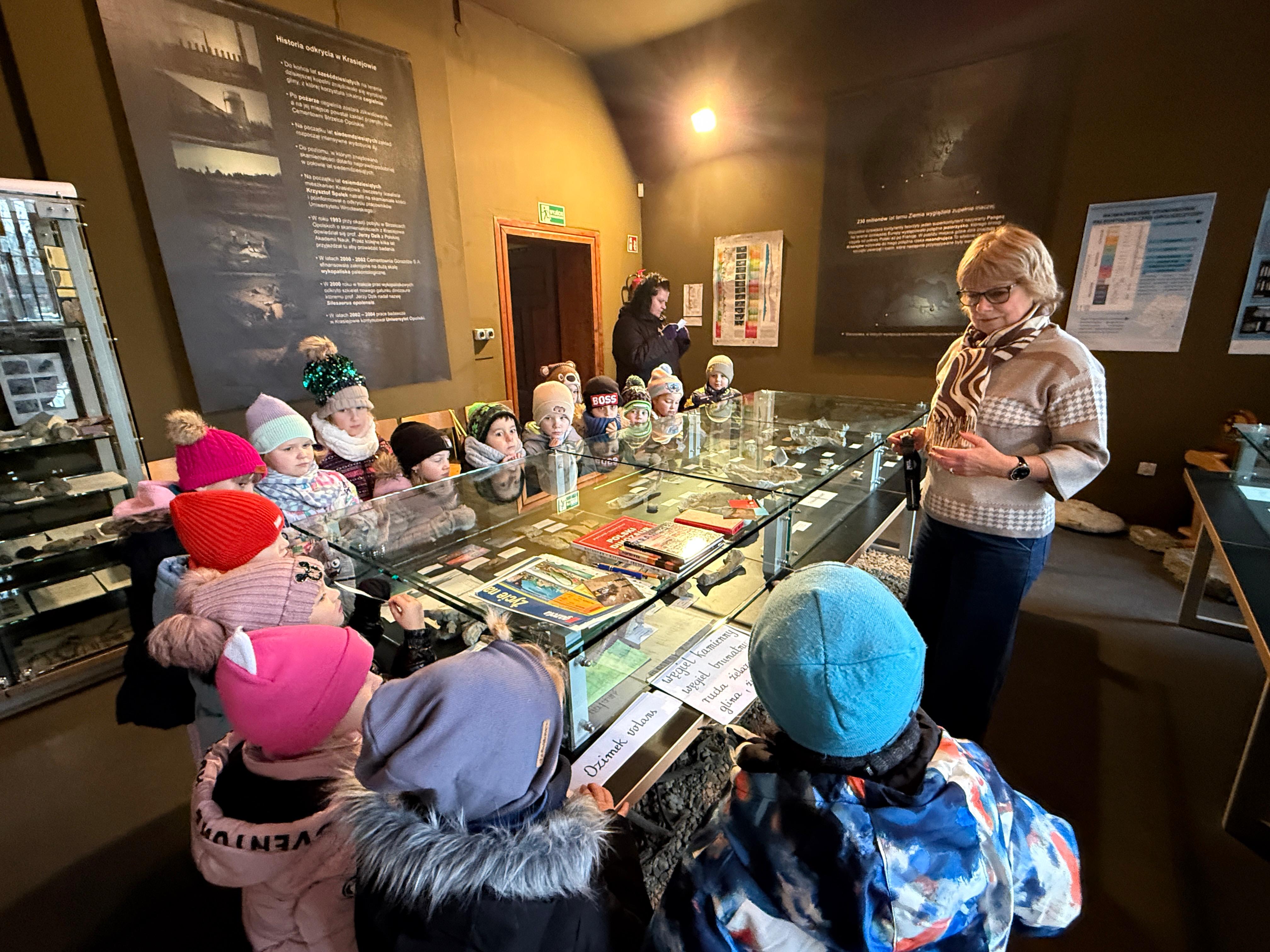 W dniu 3 grudnia dwie grupy przedszkolaków (około 50 osób) wraz z opiekunkami przybyły do Muzeum Paleontologicznego i Izby Regionalnej w Krasiejowie na zajęcia edukacyjne. Na placu szkolnym rozpoznawały prehistoryczne zwierzęta, które żyły na tym terenie przed 225 milionami lat i odróżniały je od ewolucyjnie późniejszych gatunków dinozaurów, których modele znajdują się na placu szkolnym. Po wejściu do sali muzealnej przywitał dzieci nasz Silesaurus opolensis, który założył na te okoliczność odświętną czapeczkę. Oprowadzająca omówiła, kim jest paleontolog i na czym polega jego praca, pokazywała skamieniałości, a dzieci rozpoznawały części metopozaura w szklanej gablocie. Następnie wspólnie szukali odpowiedzi na pytanie, czy w Krasiejowie mieszkali górnicy i czym różni się ich praca od pracy paleontologa. Dzieci rozpoznawały surowce skalne: węgiel kamienny, wapień, glinę, żwir, bazalt i rudy żelaza, a więc te wszystkie, które górnicy wydobywają obecnie lub były eksploatowane na Górnym Śląsku i na Opolszczyźnie. Kustosz porównała strój i wyposażenie paleontologa i górnika, zademonstrowała latarkę czołówkę i kask ochronny. Wyjaśniła, skąd wzięła się nazwa ulicy Cegielnianej i kto odkrył te lokalne skarby. Po zwiedzeniu muzeum na parterze dzieci udały się do sali regionalnej, aby omówić wybrane zagadnienia z historii wsi i obejrzeć sprzęty, którymi dawniej posługiwali się mieszkańcy, wykonujące różne zanikające już zawody. Dzieci dowiedziały się, ile kościołów było w naszej wsi, dlaczego na wystawie znajdują się duże banknoty i świadectwa szkolne niemieckie, jak wyglądała dawna zabudowa i kiedy był wielki pożar. Maluszkom bardzo podobała się też wystawa z ekspozycją zabawek- przeróżnych samochodów strażackich z prywatnej kolekcji Pana Malisza. Oprowadzająca otrzymała piękne podziękowanie od przedszkolaków. Na zakończenie dzieci z drugiej grupy ubrały odświętnie naszego silezaura kolorowymi bombkami i udały się w drogę powrotną do przedszkola. Zajęcia były dofinansowane z Budżetu Gminy Ozimek.