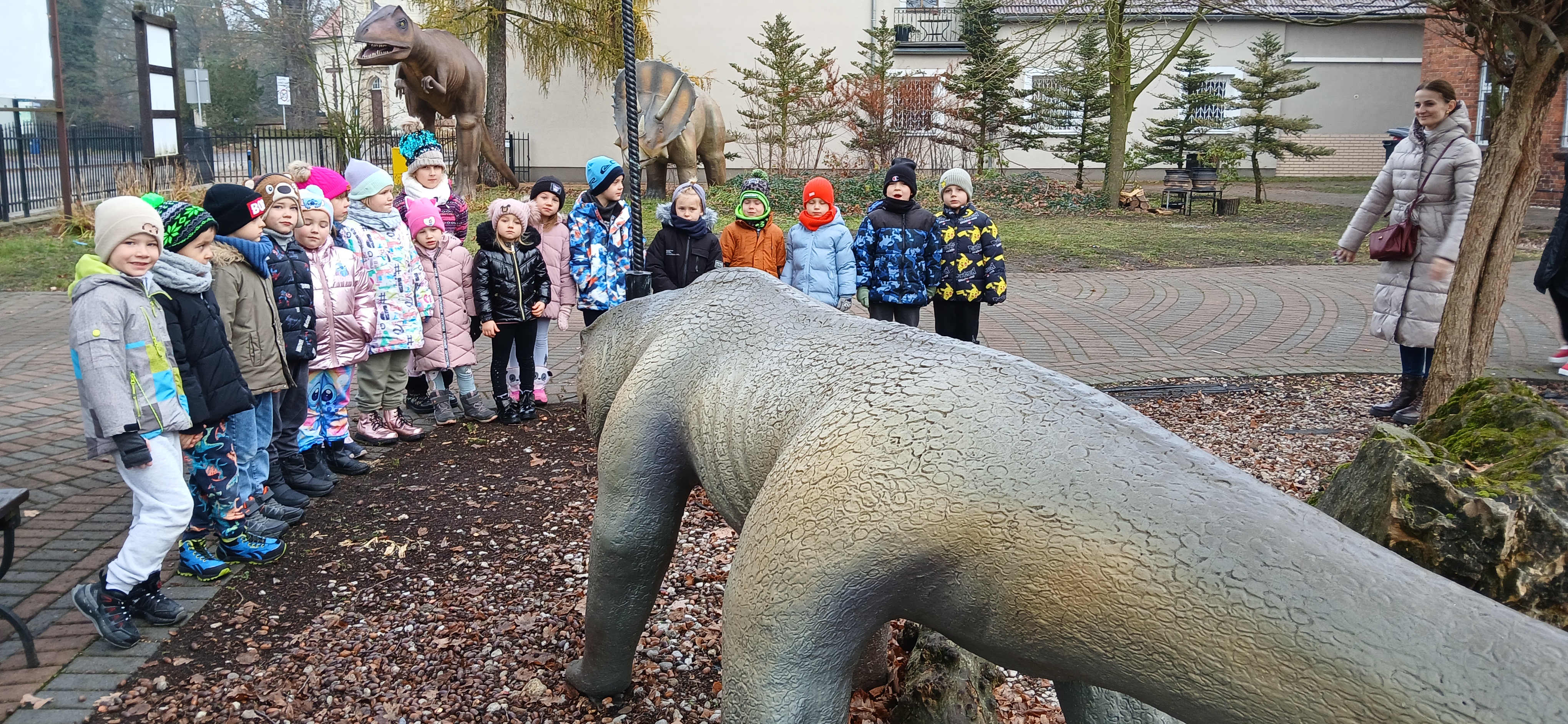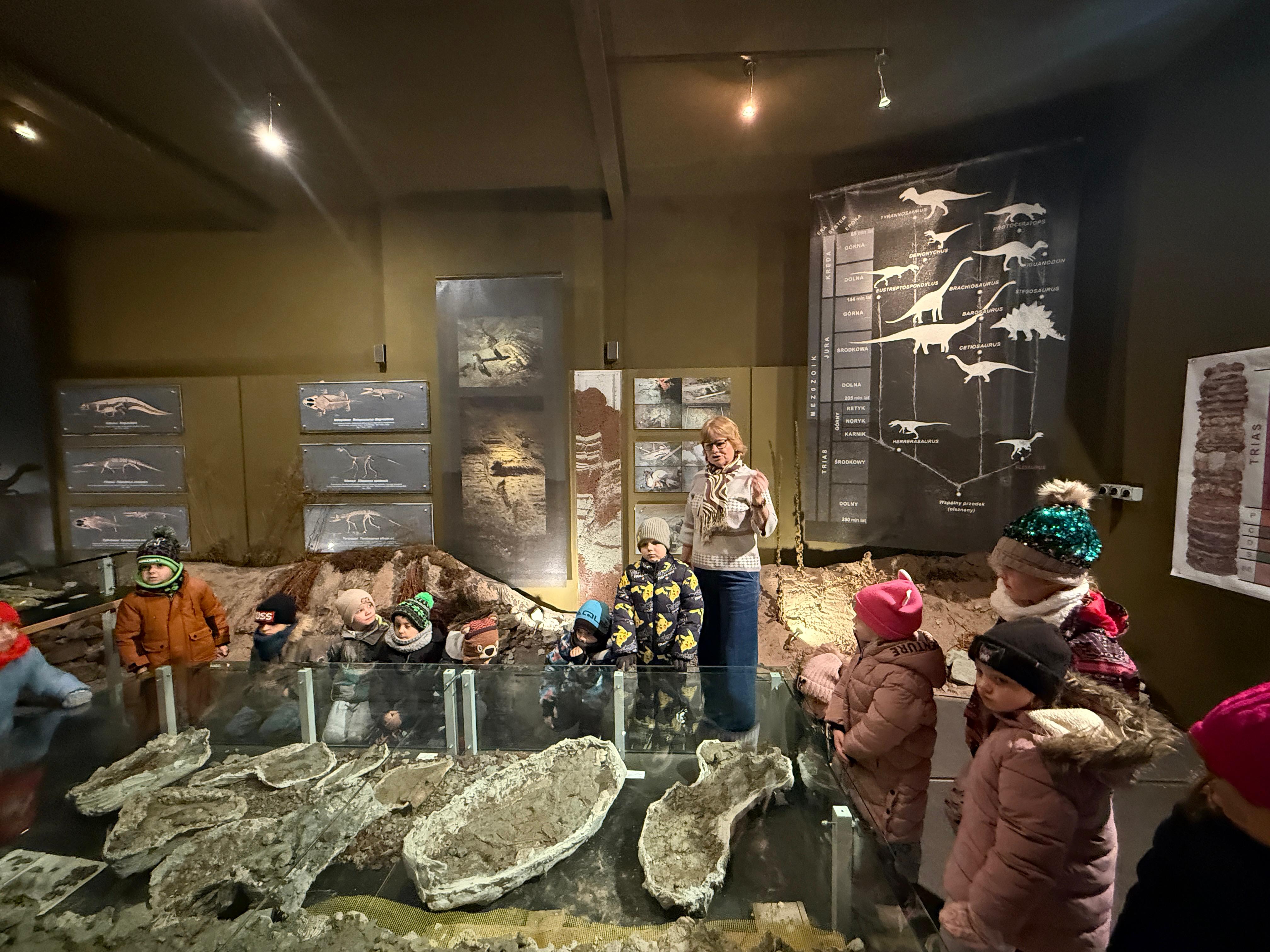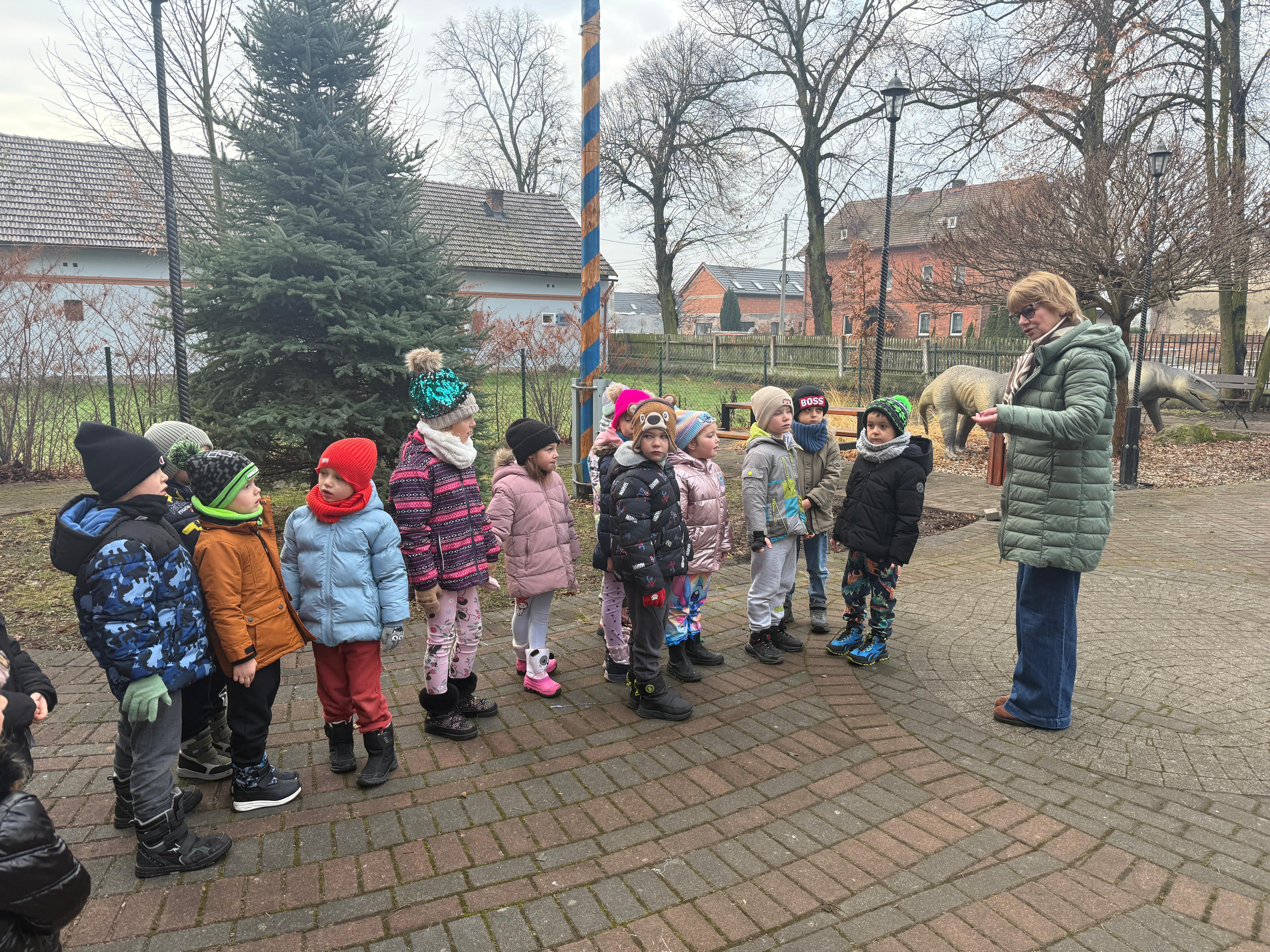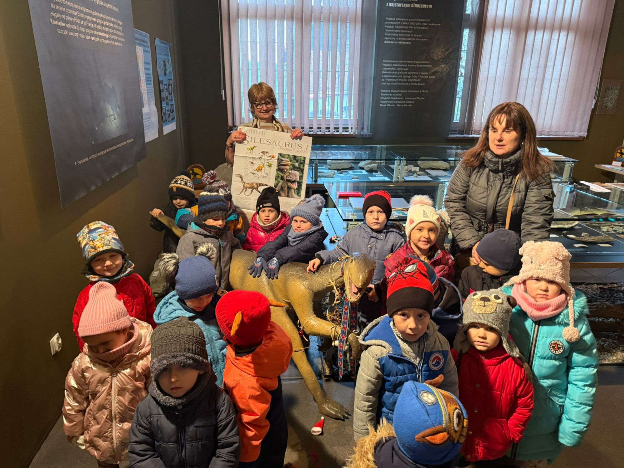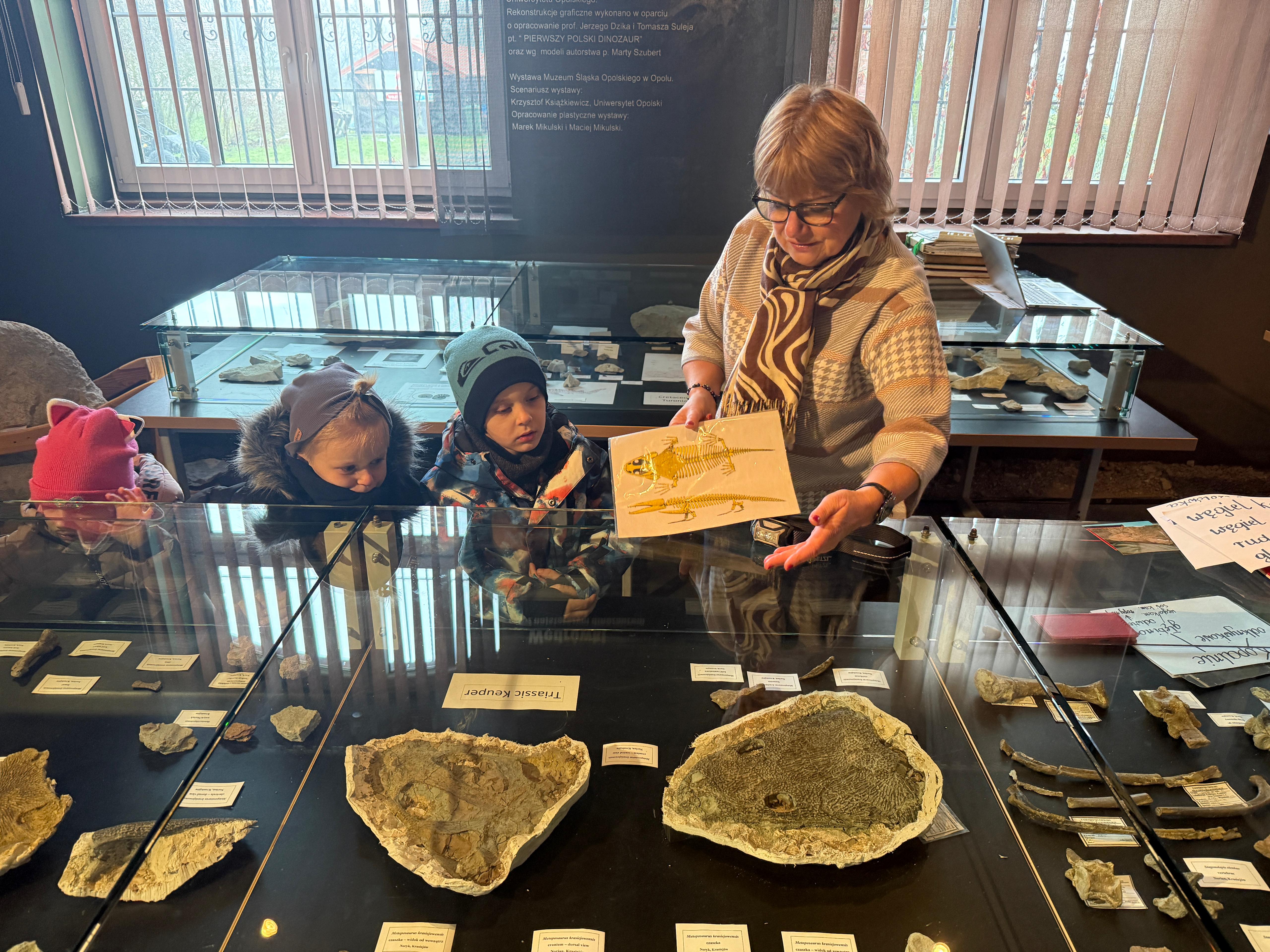 W dniu 3 grudnia dwie grupy przedszkolaków (około 50 osób) wraz z opiekunkami przybyły do Muzeum Paleontologicznego i Izby Regionalnej w Krasiejowie na zajęcia edukacyjne. Na placu szkolnym rozpoznawały prehistoryczne zwierzęta, które żyły na tym terenie przed 225 milionami lat i odróżniały je od ewolucyjnie późniejszych gatunków dinozaurów, których modele znajdują się na placu szkolnym. Po wejściu do sali muzealnej przywitał dzieci nasz Silesaurus opolensis, który założył na te okoliczność odświętną czapeczkę. Oprowadzająca omówiła, kim jest paleontolog i na czym polega jego praca, pokazywała skamieniałości, a dzieci rozpoznawały części metopozaura w szklanej gablocie. Następnie wspólnie szukali odpowiedzi na pytanie, czy w Krasiejowie mieszkali górnicy i czym różni się ich praca od pracy paleontologa. Dzieci rozpoznawały surowce skalne: węgiel kamienny, wapień, glinę, żwir, bazalt i rudy żelaza, a więc te wszystkie, które górnicy wydobywają obecnie lub były eksploatowane na Górnym Śląsku i na Opolszczyźnie. Kustosz porównała strój i wyposażenie paleontologa i górnika, zademonstrowała latarkę czołówkę i kask ochronny. Wyjaśniła, skąd wzięła się nazwa ulicy Cegielnianej i kto odkrył te lokalne skarby. Po zwiedzeniu muzeum na parterze dzieci udały się do sali regionalnej, aby omówić wybrane zagadnienia z historii wsi i obejrzeć sprzęty, którymi dawniej posługiwali się mieszkańcy, wykonujące różne zanikające już zawody. Dzieci dowiedziały się, ile kościołów było w naszej wsi, dlaczego na wystawie znajdują się duże banknoty i świadectwa szkolne niemieckie, jak wyglądała dawna zabudowa i kiedy był wielki pożar. Maluszkom bardzo podobała się też wystawa z ekspozycją zabawek- przeróżnych samochodów strażackich z prywatnej kolekcji Pana Malisza. Oprowadzająca otrzymała piękne podziękowanie od przedszkolaków. Na zakończenie dzieci z drugiej grupy ubrały odświętnie naszego silezaura kolorowymi bombkami i udały się w drogę powrotną do przedszkola. Zajęcia były dofinansowane z Budżetu Gminy Ozimek.