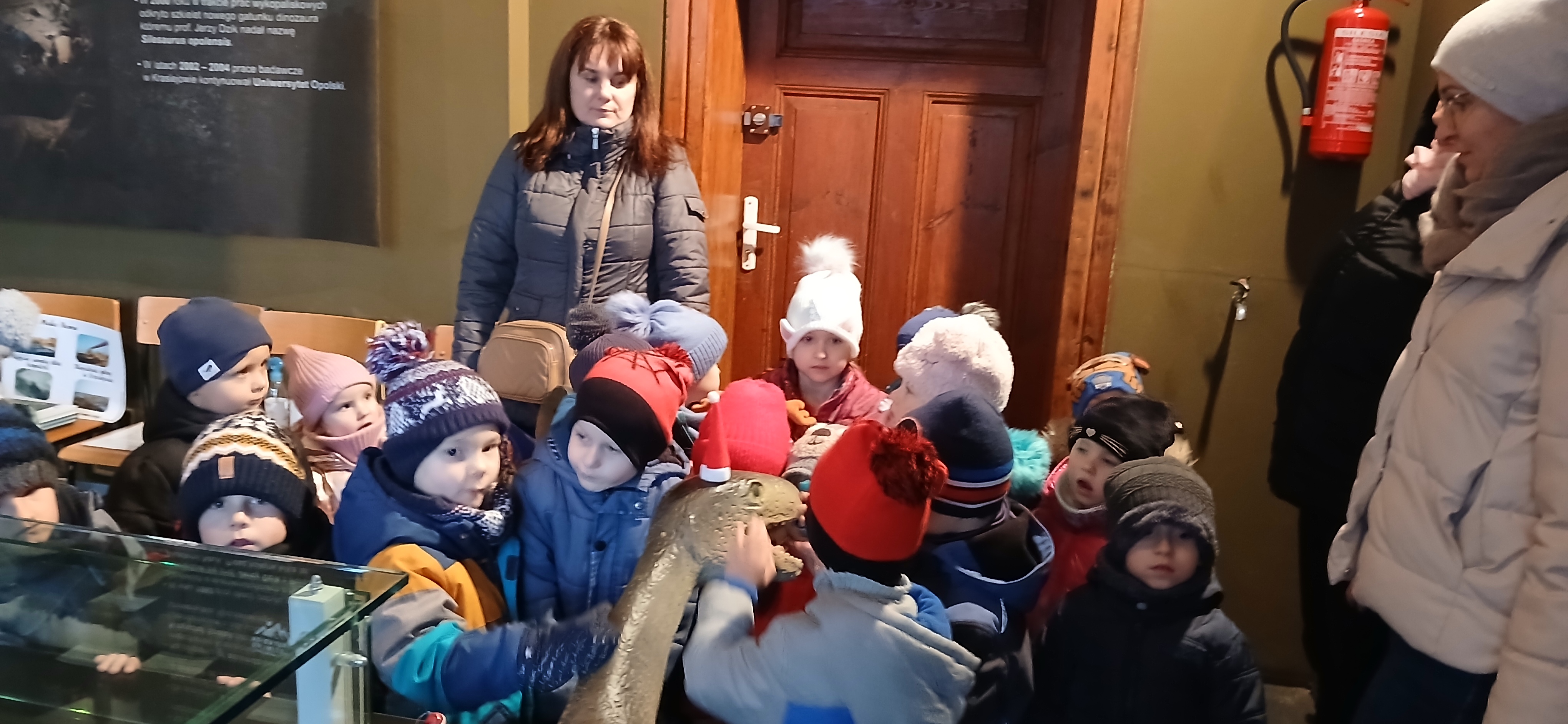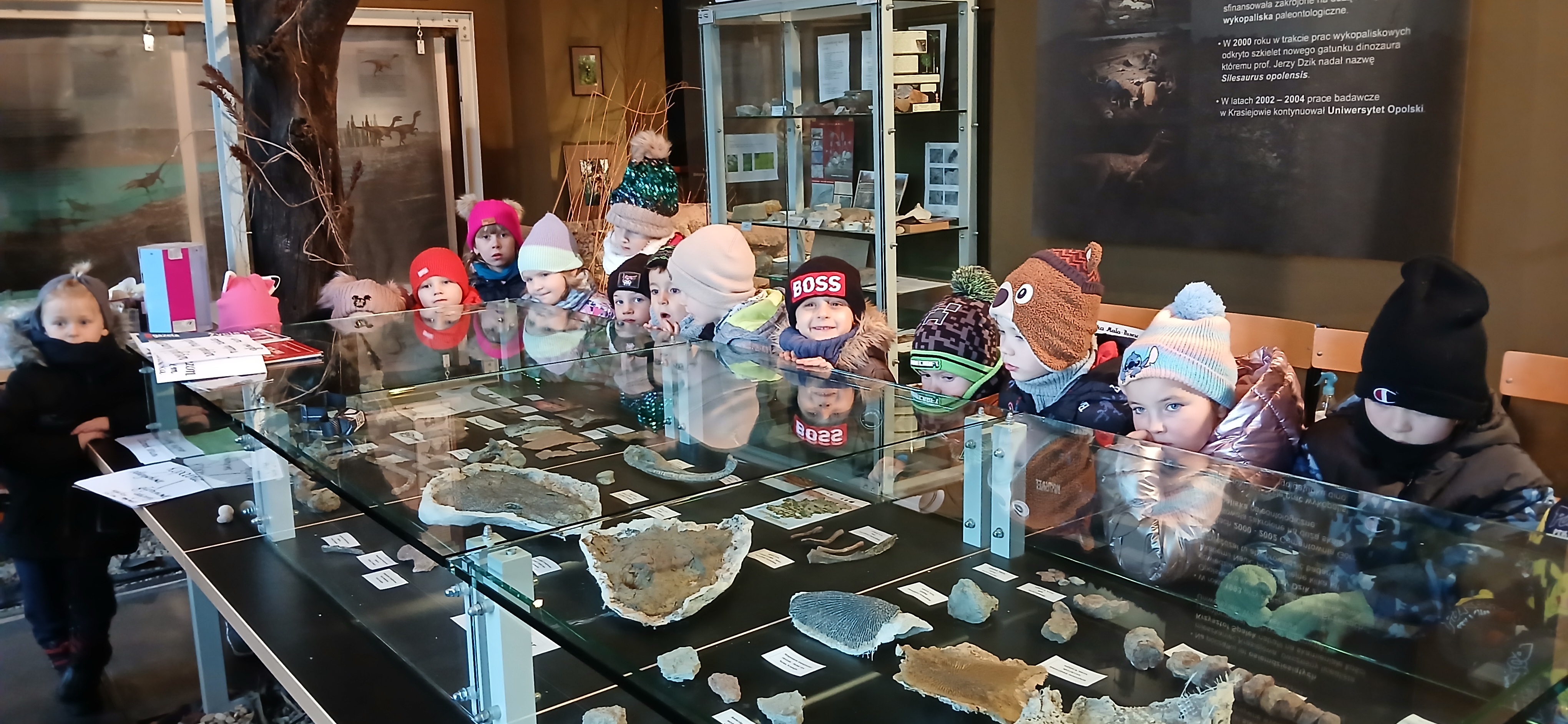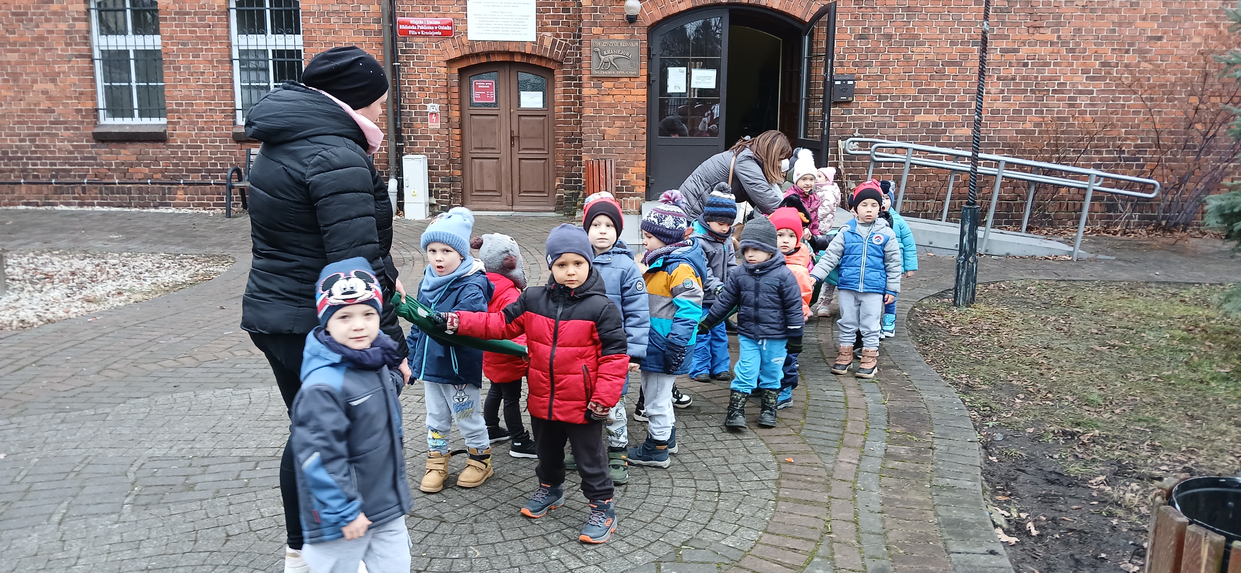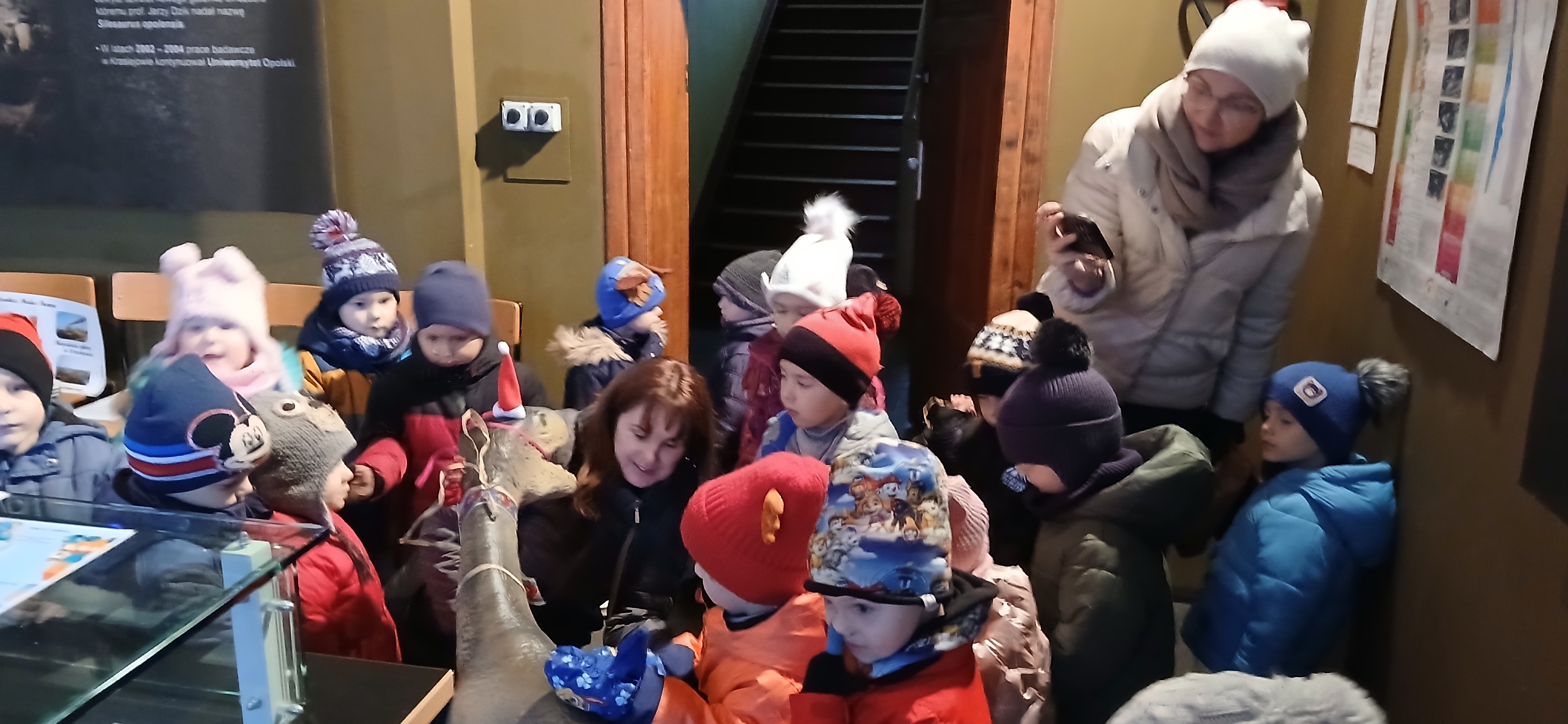 W dniu 3 grudnia dwie grupy przedszkolaków (około 50 osób) wraz z opiekunkami przybyły do Muzeum Paleontologicznego i Izby Regionalnej w Krasiejowie na zajęcia edukacyjne. Na placu szkolnym rozpoznawały prehistoryczne zwierzęta, które żyły na tym terenie przed 225 milionami lat i odróżniały je od ewolucyjnie późniejszych gatunków dinozaurów, których modele znajdują się na placu szkolnym. Po wejściu do sali muzealnej przywitał dzieci nasz Silesaurus opolensis, który założył na te okoliczność odświętną czapeczkę. Oprowadzająca omówiła, kim jest paleontolog i na czym polega jego praca, pokazywała skamieniałości, a dzieci rozpoznawały części metopozaura w szklanej gablocie. Następnie wspólnie szukali odpowiedzi na pytanie, czy w Krasiejowie mieszkali górnicy i czym różni się ich praca od pracy paleontologa. Dzieci rozpoznawały surowce skalne: węgiel kamienny, wapień, glinę, żwir, bazalt i rudy żelaza, a więc te wszystkie, które górnicy wydobywają obecnie lub były eksploatowane na Górnym Śląsku i na Opolszczyźnie. Kustosz porównała strój i wyposażenie paleontologa i górnika, zademonstrowała latarkę czołówkę i kask ochronny. Wyjaśniła, skąd wzięła się nazwa ulicy Cegielnianej i kto odkrył te lokalne skarby. Po zwiedzeniu muzeum na parterze dzieci udały się do sali regionalnej, aby omówić wybrane zagadnienia z historii wsi i obejrzeć sprzęty, którymi dawniej posługiwali się mieszkańcy, wykonujące różne zanikające już zawody. Dzieci dowiedziały się, ile kościołów było w naszej wsi, dlaczego na wystawie znajdują się duże banknoty i świadectwa szkolne niemieckie, jak wyglądała dawna zabudowa i kiedy był wielki pożar. Maluszkom bardzo podobała się też wystawa z ekspozycją zabawek- przeróżnych samochodów strażackich z prywatnej kolekcji Pana Malisza. Oprowadzająca otrzymała piękne podziękowanie od przedszkolaków. Na zakończenie dzieci z drugiej grupy ubrały odświętnie naszego silezaura kolorowymi bombkami i udały się w drogę powrotną do przedszkola. Zajęcia były dofinansowane z Budżetu Gminy Ozimek.