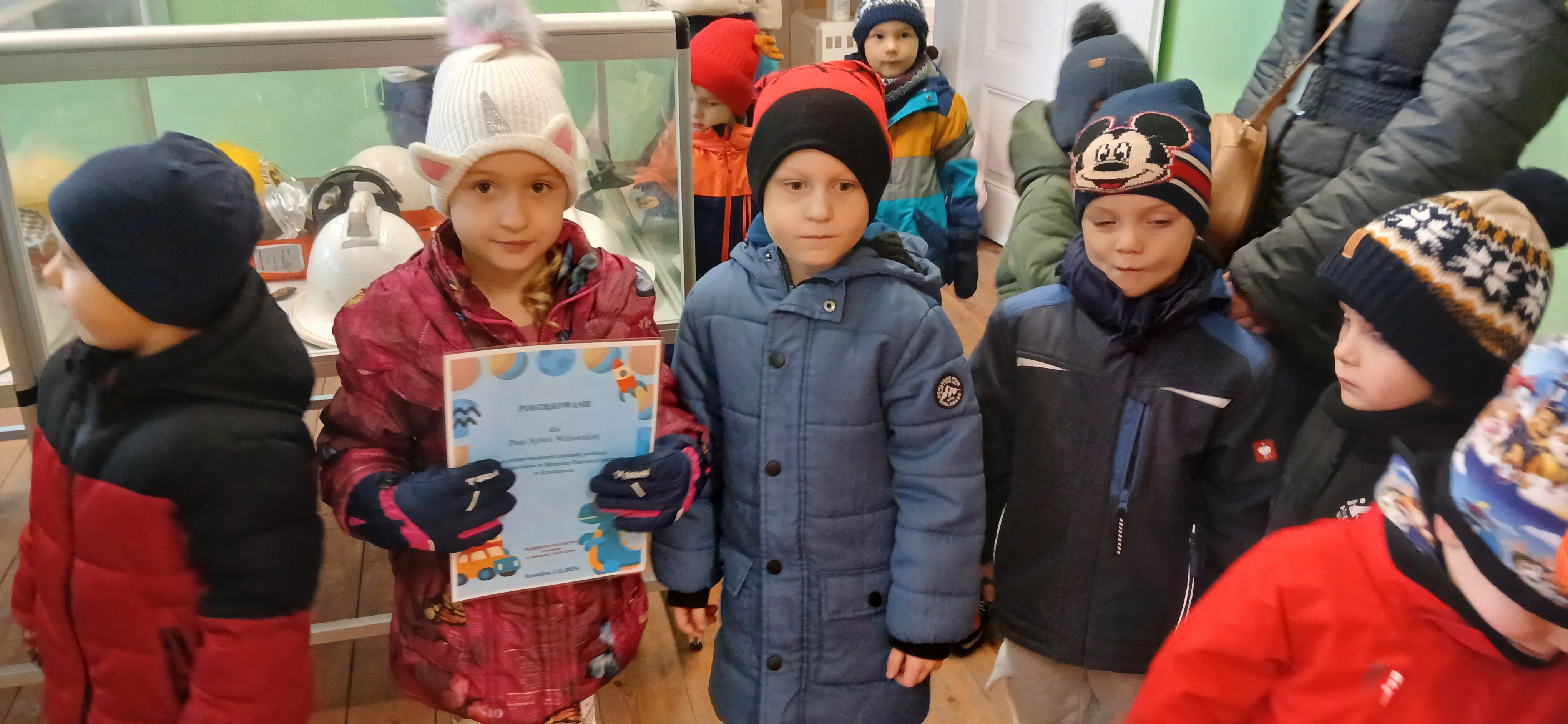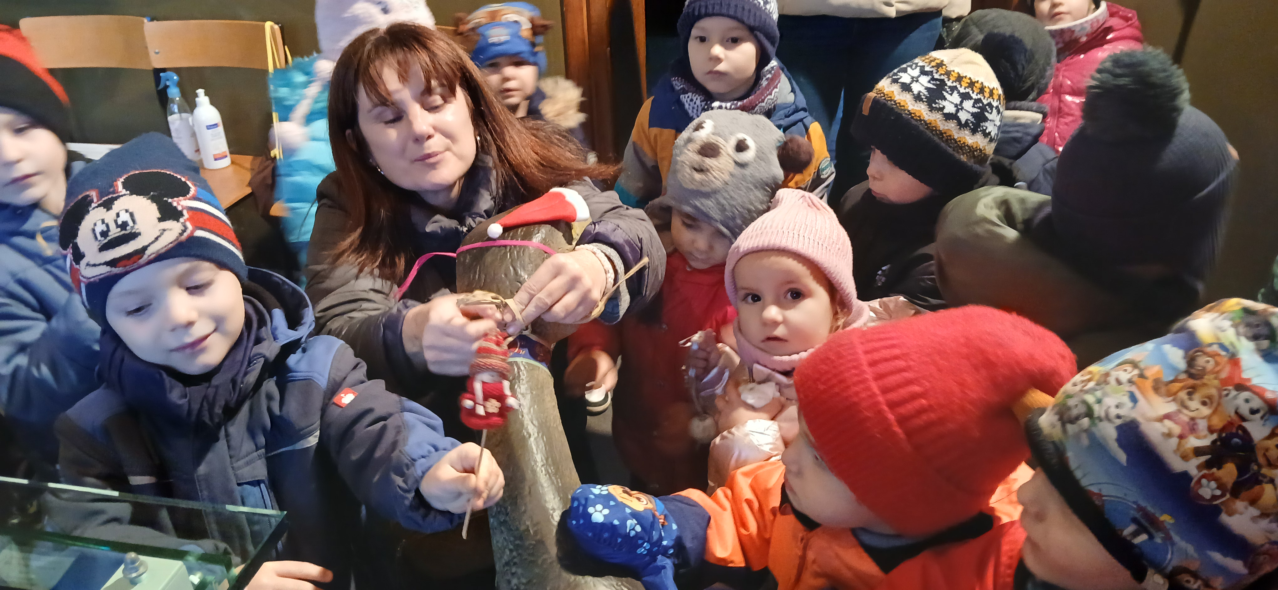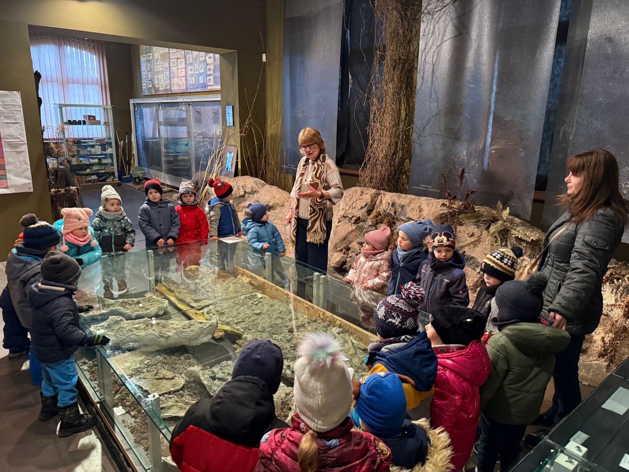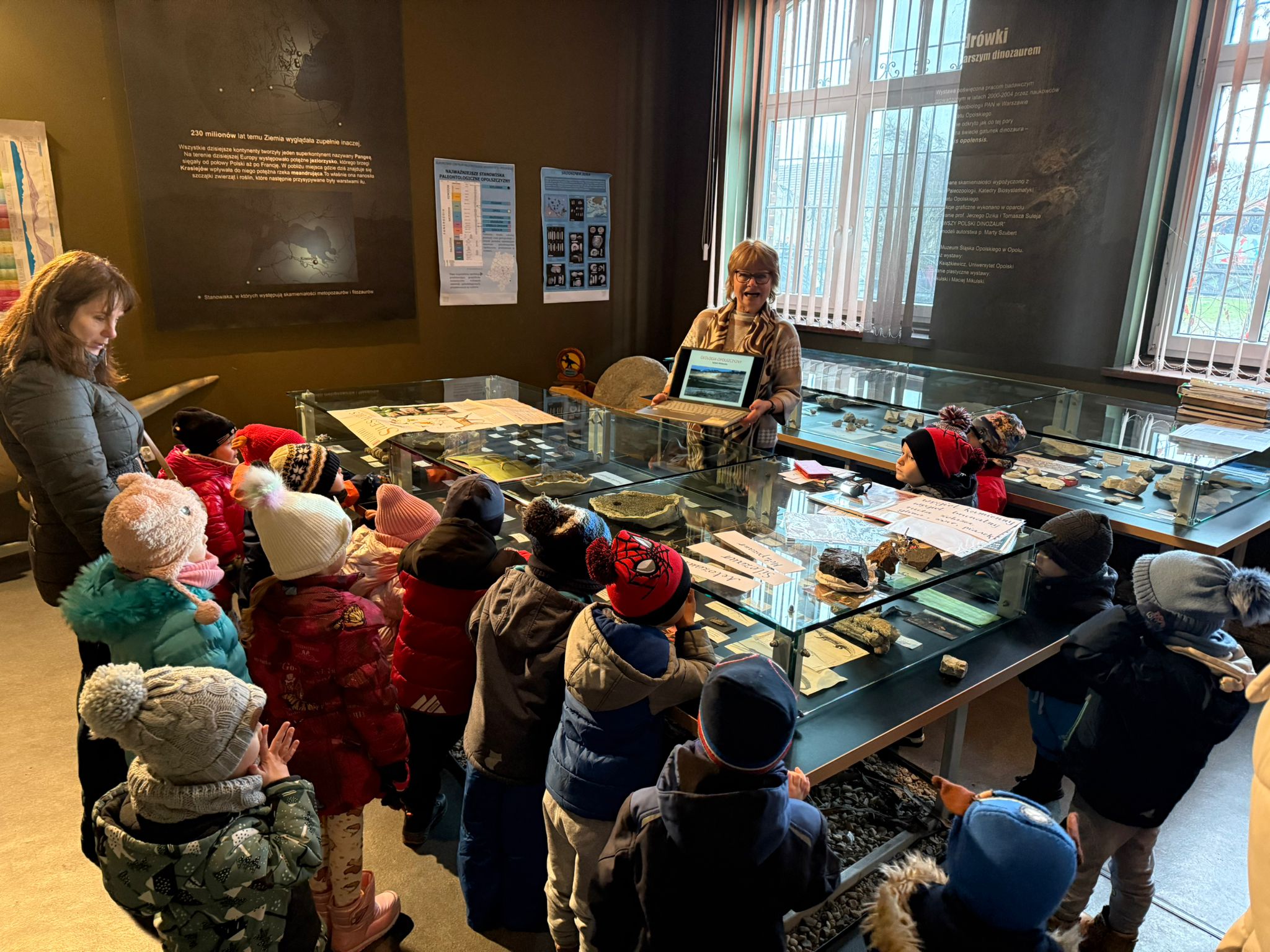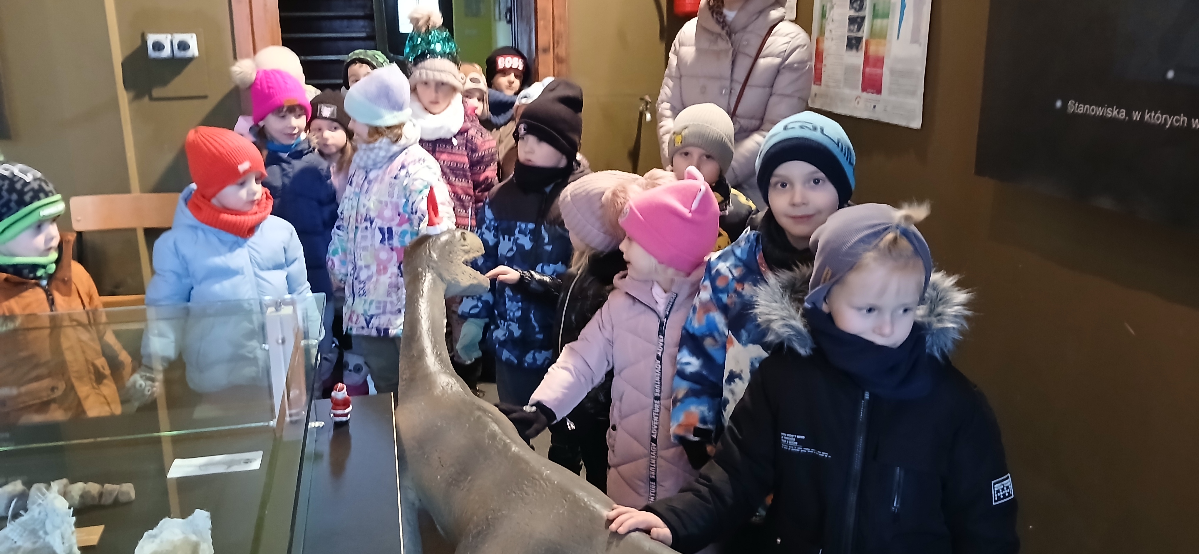 W dniu 3 grudnia dwie grupy przedszkolaków (około 50 osób) wraz z opiekunkami przybyły do Muzeum Paleontologicznego i Izby Regionalnej w Krasiejowie na zajęcia edukacyjne. Na placu szkolnym rozpoznawały prehistoryczne zwierzęta, które żyły na tym terenie przed 225 milionami lat i odróżniały je od ewolucyjnie późniejszych gatunków dinozaurów, których modele znajdują się na placu szkolnym. Po wejściu do sali muzealnej przywitał dzieci nasz Silesaurus opolensis, który założył na te okoliczność odświętną czapeczkę. Oprowadzająca omówiła, kim jest paleontolog i na czym polega jego praca, pokazywała skamieniałości, a dzieci rozpoznawały części metopozaura w szklanej gablocie. Następnie wspólnie szukali odpowiedzi na pytanie, czy w Krasiejowie mieszkali górnicy i czym różni się ich praca od pracy paleontologa. Dzieci rozpoznawały surowce skalne: węgiel kamienny, wapień, glinę, żwir, bazalt i rudy żelaza, a więc te wszystkie, które górnicy wydobywają obecnie lub były eksploatowane na Górnym Śląsku i na Opolszczyźnie. Kustosz porównała strój i wyposażenie paleontologa i górnika, zademonstrowała latarkę czołówkę i kask ochronny. Wyjaśniła, skąd wzięła się nazwa ulicy Cegielnianej i kto odkrył te lokalne skarby. Po zwiedzeniu muzeum na parterze dzieci udały się do sali regionalnej, aby omówić wybrane zagadnienia z historii wsi i obejrzeć sprzęty, którymi dawniej posługiwali się mieszkańcy, wykonujące różne zanikające już zawody. Dzieci dowiedziały się, ile kościołów było w naszej wsi, dlaczego na wystawie znajdują się duże banknoty i świadectwa szkolne niemieckie, jak wyglądała dawna zabudowa i kiedy był wielki pożar. Maluszkom bardzo podobała się też wystawa z ekspozycją zabawek- przeróżnych samochodów strażackich z prywatnej kolekcji Pana Malisza. Oprowadzająca otrzymała piękne podziękowanie od przedszkolaków. Na zakończenie dzieci z drugiej grupy ubrały odświętnie naszego silezaura kolorowymi bombkami i udały się w drogę powrotną do przedszkola. Zajęcia były dofinansowane z Budżetu Gminy Ozimek.