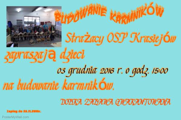 OSP Krasiejów zaprasza na kolejną edycję budowania ptasich karmników. Spotkanie odbędzie się 03.12.2016r. o godz. 15. Szczególy na załączonym plakacie.