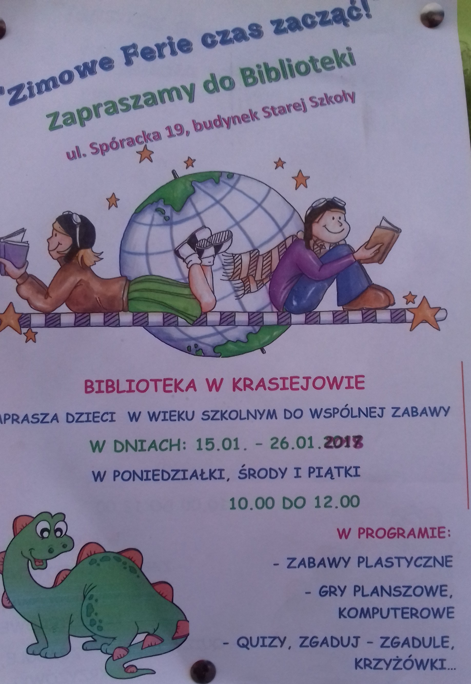 Można zgłaszać udział dzieci w bibliotece od 7.01.2018r. w godzinach pracy: od 9.00 do 17.00. Zainteresowani mogą też przychodzić na zajęcia bez wcześniejszego zgłoszenia.